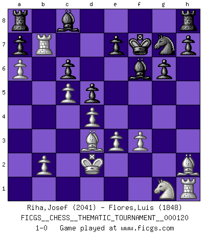 Last move : 1-0 2010 September 11 3:38:19 [Event "FICGS__CHESS__THEMATIC_TOURNAMENT__000120"] [Site "FICGS"] [Date "2010.09.02"] [Round "1"] [White "Riha,Josef"] [Black "Flores,Luis"] [Result "1-0"] [WhiteElo "2041"] [BlackElo "1848"] 1.d4 f5 2.g4 fxg4 3.Nc3 d5 4.Bf4 Nf6 5.e3 c6 6.h3 Qb6 7.Na4 Qa5+ 8.c3 Na6 9.hxg4 b5 10.Nc5 Nxc5 11.dxc5 Bxg4 12.Qd4 Qa4 13.Bd3 Kf7 14.f3 Qxd4 15.cxd4 Bd7 16.a4 b4 17.a5 g6 18.Ra4 Nh5 19.Bh2 b3 20.Rb4 Bg7 21.Rxb3 Bc8 22.a6 Bf6 23.Kd2 Ng7 24.Rb7 1-0 Dutch, Krejcik gambit Player White won this chess game. Follow this game move after move (download)Chess is a forcing house where the fruits of character can ripen more fully than in life. (Edward Morgan Foster) Über Kasparov: Es ist offensichtlich, daß er in einem totalitären Staat aufwuchs und deshalb zu diktatorischen Zügen neigt. (Viktor Kortschnoi) ¿Porque tengo que perder ante este idiota?. (Aron Nimzovich) Le pion, dans sa simplicité, marche droit devant lui, mais lorsqu'il prend, il le fait obliquement? Ainsi l'homme, tant qu'il reste pauvre, marche dans la droiture et vit honnêtement, mais lorsqu'il recherche les honneurs, il flatte, se parjure et, par les voies obliques, cherche une position supérieure sur l'échiquier du monde. (Jean de Galles) To send light into the darkness of men's hearts - such is the duty of the artist. (Schumann)