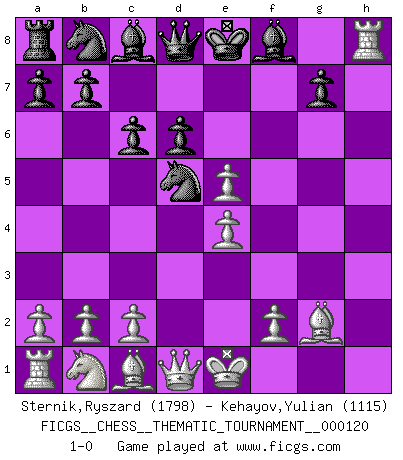 Last move : 1-0 2010 September 2 23:32:41 [Event "FICGS__CHESS__THEMATIC_TOURNAMENT__000120"] [Site "FICGS"] [Date "2010.09.02"] [Round "1"] [White "Sternik,Ryszard"] [Black "Kehayov,Yulian"] [Result "1-0"] [WhiteElo "1798"] [BlackElo "1115"] 1.d4 f5 2.g4 fxg4 3.h3 gxh3 4.Nxh3 d6 5.Ng5 e5 6.Bg2 Be7 7.Nxh7 c6 8.Nf6+ Nxf6 9.Rxh8+ Bf8 10.dxe5 Nd5 11.e4 1-0 Dutch, Krejcik gambit Player White won this chess game. Follow this game move after move (download)Pawns: they are the soul of this game, they alone form the attack and defense. (Philidor) Ein bischen Romantik kann weder im Schach noch in der Liebe schaden. Also versuche ich mich ab und zu daran zu erinnern. (Nigel Short) No es una movida, aún la mejor movida que tu debas buscar, sino un plan comprensible. (Eugene Znosko-Borovsky) Ce qui caractérise les parties de combat, c'est que si le défenseur a constamment de difficiles problèmes à résoudre, l'attaquant doit chercher sans relâche de nouvelles possibilités d'attaque. (Koblentz) Waiting for chance ? Play in casinos. (FICGS proverb)
