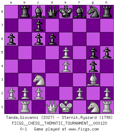 Last move : 0-1 2010 September 27 17:55:53 [Event "FICGS__CHESS__THEMATIC_TOURNAMENT__000120"] [Site "FICGS"] [Date "2010.09.02"] [Round "1"] [White "Tanda,Giovanni"] [Black "Sternik,Ryszard"] [Result "0-1"] [WhiteElo "2027"] [BlackElo "1798"] 1.d4 f5 2.g4 fxg4 3.e4 e5 4.dxe5 d6 5.Bf4 Nc6 6.Bb5 a6 7.Bxc6+ bxc6 8.Nc3 Rb8 9.Rb1 g5 10.Bg3 h5 0-1 Dutch, Krejcik gambit Player Black won this chess game. Follow this game move after move (download)Up to this point White has been following well-known analysis. But now he makes a fatal error: he begins to use his own head. (Siegbert Tarrasch) Ich würde mich als ganz normalen Jungen bezeichnen [Im Alter von 12]. (Sergej Karjakin) El Ajedrez es un regaderazo frío para la mente. (Sir John Simon) Même un GMI sait rarement calculer sur plus de cinq coups une attaque à sacrifices. (Rudolf Spielmann) Heh, heh, heh. Time to abandon ship. (General Grievous in Star Wars ep.3)