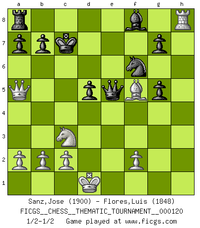 Last move : 1/2-1/2 2010 November 21 19:10:27 [Event "FICGS__CHESS__THEMATIC_TOURNAMENT__000120"] [Site "FICGS"] [Date "2010.09.02"] [Round "1"] [White "Sanz,Jose"] [Black "Flores,Luis"] [Result "1/2-1/2"] [WhiteElo "1900"] [BlackElo "1848"] 1.d4 f5 2.g4 fxg4 3.Nc3 d5 4.Bg5 Nf6 5.h3 c5 6.e3 cxd4 7.exd4 Nc6 8.Qd2 h6 9.hxg4 Bxg4 10.Bd3 Qd6 11.Bg6+ Kd7 12.Nge2 e5 13.O-O-O Nxd4 14.Nxd4 exd4 15.Qxd4 hxg5 16.Rxh8 Bxd1 17.Bf5+ Kc6 18.Qa4+ Kb6 19.Qb5+ Kc7 20.Kxd1 Qe5 21.Qa5+ 1/2-1/2 Dutch, Krejcik gambit Queenside Castling by player White (move 13) This chess game ended in a draw. Follow this game move after move (download)We like to think. (Gary Kasparov) Das Schach hält seine Meister in eigenen Banden, Fesseln; auf vielerlei Weise formt es ihren Geist, so dass die innere Freiheit selbst des Stärksten beeinflusst wird. (Albert Einstein) El Ajedrez, como cualquier otra actividad creativa, puede existir solo a través de méritos combinados de aquellos que tienen talento creativo y de aquellos que tienen la habilidad de organizar un trabajo creativo. (Mikhail Botvinnik) Horreur, mais aussi harmonie suprême : qu'y avait-il en effet au monde en dehors des échecs ? Le brouillard, l'inconnu, le non-être... (Vladimir Nabokov) A good player is always lucky. (Capablanca)
