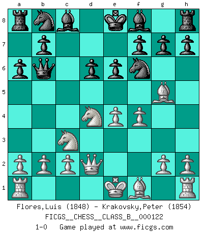 Last move : 1-0 2010 October 14 12:34:25 [Event "FICGS__CHESS__CLASS_B__000122"] [Site "FICGS"] [Date "2010.09.03"] [Round "1"] [White "Flores,Luis"] [Black "Krakovsky,Peter"] [Result "1-0"] [WhiteElo "1848"] [BlackElo "1854"] 1.e4 c5 2.Nf3 d6 3.d4 cxd4 4.Nxd4 Nf6 5.Nc3 a6 6.Bg5 e6 7.f4 Qb6 8.Qd2 1-0 Sicilian : Najdorf, 7...Qb6 Player White won this chess game. Follow this game move after move (download)I prefer to lose a really good game than to win a bad one. (David Levy) Alle Schachspieler sollten auch ein Hobby haben. (Savielly Grigorievitsch Tartakower) Me siento como si fuera una pieza en una partida de Ajedrez, cuando mi oponente me indica: esa pieza no puede ser movida. (Soren Kierkegaard) Si je n'étais pas joueur d'échecs, je serais le meilleur dans quelque chose d'autre. (Anatoli Karpov) Men should grow up. - Yeah. And dogs should stop licking themselves. It's not gonna happen. (Gregory House to Dr. Cameron, House M.D.)