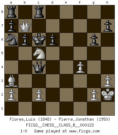 Last move : 1-0 2011 January 4 18:56:55 [Event "FICGS__CHESS__CLASS_B__000122"] [Site "FICGS"] [Date "2010.09.03"] [Round "1"] [White "Flores,Luis"] [Black "Pierre,Jonathan"] [Result "1-0"] [WhiteElo "1848"] [BlackElo "1950"] 1.e4 d6 2.d4 Nf6 3.Nc3 g6 4.f4 Bg7 5.Nf3 c5 6.Bb5+ Bd7 7.e5 Ng4 8.e6 fxe6 9.Ng5 Bxb5 10.Nxe6 Bxd4 11.Nxb5 Qa5+ 12.Qd2 Bf2+ 13.Kd1 Ne3+ 14.Ke2 Qxb5+ 15.Kxf2 Ng4+ 16.Kg3 Kd7 17.Re1 Nh6 18.b3 c4 19.h3 cxb3 20.Rb1 Rc8 21.Rxb3 Qc6 22.Kh2 b6 23.Qe2 Ng8 24.Ba3 Qc4 25.Rd3 Na6 26.Rxd6+ exd6 27.Nf8+ Kd8 28.Qe8+ Kc7 29.Re7+ Nxe7 30.Qxe7+ Kb8 31.Nd7+ Kc7 32.Nc5 Kc6 33.Qb7+ 1-0 Pirc : Austrian attack, Dragon formation Player White won this chess game. Follow this game move after move (download)Chess is imagination. (David Bronstein) Sicherlich können nur Meister einen Stil haben. Daß ein nicht-Meister auch nur ein einziges Mal in seinem Leben eine Partie folgerecht durchführte, habe ich niemals bemerkt. (Emanuel Lasker) El Rey es una pieza de pelea. ¡Usenlo!. (Wilhelm Steinitz) On est toujours la mazette de quelqu'un d'autre. (Anonyme) Remember : Your focus determines your reality. (Qui-Gon Jinn in Star Wars ep.1)