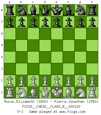 Last move : 0-1 2010 October 13 9:47:43 [Event "FICGS__CHESS__CLASS_B__000122"] [Site "FICGS"] [Date "2010.09.03"] [Round "1"] [White "Ruruk,Elizabeth"] [Black "Pierre,Jonathan"] [Result "0-1"] [WhiteElo "1800"] [BlackElo "1950"] 0-1 This chess game has been lost on time (started : 2010.09.03 2:42:0) Player Black won this chess game. Follow this game move after move (download)Only the player with the initiative has the right to attack. (Wilhelm Steinitz) Es gibt keine einzige Frau, der ich nicht einen Springer vorgeben könnte und trotzdem gewänne. (Robert James Fischer) Nos gusta pensar. (Gary Kasparov) Toutes choses étant égales, c'est la conviction qui gagne. Alliée à une volonté de vaincre, elle sert de détonateur, suscite des idées, disperse les doutes et aide à penser clairement. (Robert Fischer) This is where the fun begins. (Anakin Skywalker in Star Wars ep.3)