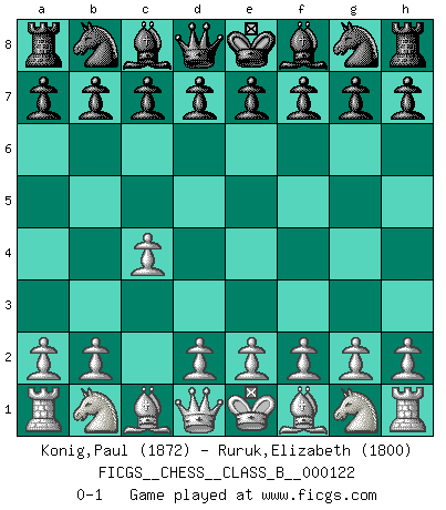 Last move : 0-1 2010 September 3 2:45:59 [Event "FICGS__CHESS__CLASS_B__000122"] [Site "FICGS"] [Date "2010.09.03"] [Round "1"] [White "Konig,Paul"] [Black "Ruruk,Elizabeth"] [Result "0-1"] [WhiteElo "1872"] [BlackElo "1800"] 1.c4 0-1 English Opening Player Black won this chess game. Follow this game move after move (download)I have always a slight feeling of pity for the man who has no knowledge of Chess. (Siegbert Tarrasch) Herr Iljumschinow ist ein etwas merkwürdiger Geschäftsmann: Er arbeitet zusammen mit Leuten wie Muammar al-Gaddafi; früher ist das Saddam Hussein gewesen. (Joel Lautier) El Jaque al descubierto es el bombardero del tablero. (Reuben Fine) Je ne crois pas en la psychologie, je crois aux bons coups. (Robert Fischer) No, I am still playing. (Anatoly Karpov)