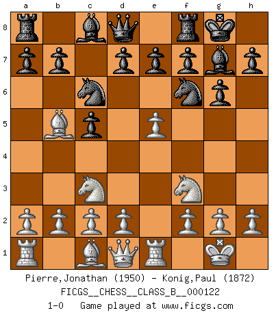 Last move : 1-0 2010 September 12 12:21:42 [Event "FICGS__CHESS__CLASS_B__000122"] [Site "FICGS"] [Date "2010.09.03"] [Round "1"] [White "Pierre,Jonathan"] [Black "Konig,Paul"] [Result "1-0"] [WhiteElo "1950"] [BlackElo "1872"] 1.e4 c5 2.Nf3 Nc6 3.Bb5 g6 4.O-O Bg7 5.Re1 Nf6 6.Nc3 O-O 7.e5 1-0 Sicilian : Nimzovich-Rossolimo attack (with ...g6, without ...d6) Kingside Castling by player White (move 4) Kingside Castling by player Black (move 6) Player White won this chess game. Follow this game move after move (download)A great player and a great example for many. His book My 60 Memorable Games had a big impact on me. It is a shame he didn't continue to enrich the world of chess with his unparalleled understanding after 1972. (Jan Timman, about Bobby Fischer's death) Das Zentrum ist der Balkan des Schachbretts - Kriegshandlungen können in jedem Moment ausbrechen. (Aaron Nimzowitsch) Me siento como si fuera una pieza en una partida de Ajedrez, cuando mi oponente me indica: esa pieza no puede ser movida. (Soren Kierkegaard) A chaque perte on perd un peu de soi. (Joël Lautier) Without deviation from the norm, progress is not possible. (Frank Zappa)