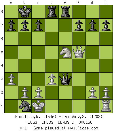 Last move : 0-1 2010 November 20 14:19:25 [Event "FICGS__CHESS__CLASS_C__000156"] [Site "FICGS"] [Date "2010.09.03"] [Round "1"] [White "Paolillo,Giampiero"] [Black "Denchev,Stanimir"] [Result "0-1"] [WhiteElo "1646"] [BlackElo "1703"] 1.e4 e5 2.Nc3 Nf6 3.f4 d6 4.Nf3 Nc6 5.Bb5 Be7 6.d3 Bd7 7.Bxc6 Bxc6 8.fxe5 dxe5 9.Nxe5 Qd4 10.Nf3 Qb6 11.Rb1 O-O-O 12.Qe2 Bb4 13.Bd2 Rhe8 14.a3 Bxc3 15.Bxc3 Bxe4 16.Ne5 Nd5 17.Qxe4 Nxc3 18.Qf5+ Kb8 19.Kd2 Nxb1+ 20.Kc1 Qe3+ 0-1 Vienna : Falkbeer variation Queenside Castling by player Black (move 11) Player Black won this chess game. Follow this game move after move (download)A bad plan is better than none at all. (Frank Marshall) Dein Körper muss in Topform sein. Dein Schach verfällt, wenn dein Körper verfällt. Der Körper kann nicht vom Geist getrennt werden. (Robert James Fischer) Botvinnik trató de alejar el misterio referente al Ajedrez, siempre relacionandolo a situaciones de la vida diaria. Solía llamar al Ajedrez un problema inexacto típico, similar a aquellos en que la gente tiene siempre que resolver a cada día. (Garry Kasparov) C'est la seule position que je connaisse où les deux camps sont mals. Propos prêtés à V. Anand. History is the quarrels of popes and kings, with wars or pestilences in every page; the men all so good for nothing, and hardly any women at all. (Jane Austen)