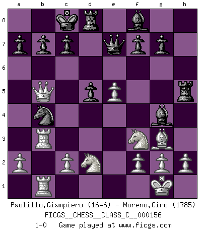 Last move : 1-0 2011 April 4 14:40:53 [Event "FICGS__CHESS__CLASS_C__000156"] [Site "FICGS"] [Date "2010.09.03"] [Round "1"] [White "Paolillo,Giampiero"] [Black "Moreno,Ciro"] [Result "1-0"] [WhiteElo "1646"] [BlackElo "1785"] 1.e4 e5 2.Nf3 Nf6 3.d4 Nxe4 4.Bd3 Nc6 5.Bxe4 d5 6.Bxh7 Rxh7 7.dxe5 Bg4 8.Qd3 Rh5 9.Bf4 Qe7 10.Nbd2 Qb4 11.Bg3 Qxb2 12.O-O O-O-O 13.Rfb1 Qa3 14.Rb3 Qe7 15.Qb5 Nb4 16.Rab1 1-0 This chess game has been lost on time (started : 2010.09.03 15:31:55) Petrov : Modern attack, Symmetrical variation Kingside Castling by player White (move 12) Queenside Castling by player Black (move 12) Player White won this chess game. Follow this game move after move (download)It is always better to sacrifice your opponent's men. (Savielly Tartakower) Wenn Spassky eine Figur opfert kannst du genauso gut aufgeben. Aber wenn Tal eine Figur opfert, spiel weiter. Er könnte noch eine weitere opfern, und dann ... wer weiß? (Miguel Najdorf) Bendita sea la memoria de aquel que dio al mundo este juego inmortal. (A. G. Gardiner) Toutes choses étant égales, c'est la conviction qui gagne. Alliée à une volonté de vaincre, elle sert de détonateur, suscite des idées, disperse les doutes et aide à penser clairement. (Robert Fischer) Looking at the proliferation of personal web pages on the Net, it looks like very soon everyone on Earth will have 15 megabytes of fame. (M.G. Sriram)