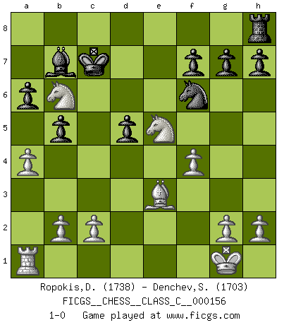 Last move : 1-0 2010 October 5 9:21:13 [Event "FICGS__CHESS__CLASS_C__000156"] [Site "FICGS"] [Date "2010.09.03"] [Round "1"] [White "Ropokis,Dimitrios"] [Black "Denchev,Stanimir"] [Result "1-0"] [WhiteElo "1738"] [BlackElo "1703"] 1.e4 c5 2.Nc3 Nc6 3.f4 e6 4.Bb5 Nd4 5.Nf3 Nxb5 6.Nxb5 d5 7.exd5 exd5 8.O-O Nf6 9.Re1+ Be7 10.Qe2 a6 11.Qxe7+ Qxe7 12.Nc7+ Kd8 13.Rxe7 Kxe7 14.Nxa8 b5 15.d4 Bb7 16.Nb6 Kd6 17.dxc5+ Kxc5 18.Be3+ Kc6 19.Ne5+ Kc7 20.a4 1-0 Sicilian : Grand Prix attack Kingside Castling by player White (move 8) Player White won this chess game. Follow this game move after move (download)The battle for the ultimate truth will never be won. And that's why Chess is so fascinating. (Hans Kmoch) Ich verstehe mehr vom Schach als irgendein anderer lebender Meister. (José Raúl Capablanca) Ciertamente el estado mental actual de Bobby Fischer es una tragedia. Uno de los mas grandes jugadores de Ajedrez del mundo -el orgullo y pena del Ajedrez Americano. (Frank Brady) Botvinnik disait en comparant les échecs à la musique: Il existe une science dont le but est l'étude de l'acoustique et des sons. Mais il y a aussi un art qui se sert de l'océan des sons : c'est la musique. De toute évidence, il en est de même pour la pensée. La logique est l'étude des lois de la réflexion et les échecs reflètent, en tant qu'art, le côté logique de la réflexion, sous la forme d'images artistiques... Extrait de Fischer - Spassky, Reykjavik 1972 par Alexander & F. Wyndham (Ed. Solar), p 37. Even the best needles are not sharp at both ends. (Chinese proverb)