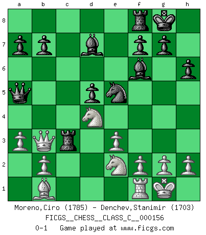 Last move : 0-1 2011 March 14 23:58:0 [Event "FICGS__CHESS__CLASS_C__000156"] [Site "FICGS"] [Date "2010.09.03"] [Round "1"] [White "Moreno,Ciro"] [Black "Denchev,Stanimir"] [Result "0-1"] [WhiteElo "1785"] [BlackElo "1703"] 1.d4 d5 2.c4 c6 3.Nf3 Nf6 4.cxd5 cxd5 5.Nc3 e6 6.Bg5 Be7 7.e3 O-O 8.Rc1 Nc6 9.Bd3 Nb4 10.Bb1 Bd7 11.a3 Nc6 12.Qb3 h6 13.Bxf6 Bxf6 14.Ne2 Qa5+ 15.Rc3 e5 16.dxe5 Nxe5 17.Nfd4 Rac8 18.O-O Rxc3 0-1 This chess game has been lost on time (started : 2010.09.03 15:31:55) QGD Slav : Exchange variation Kingside Castling by player Black (move 7) Kingside Castling by player White (move 18) Player Black won this chess game. Follow this game move after move (download)A player surprised is half beaten. (Proverb) Obwohl ich vom Stil her kaum zu den Priestern der Schachkunst gezählt werde, halte ich Schach doch für eine Kunst. (Tigran Petrosjan) Botvinnik trataba de restarle el misterio al Ajedrez, siempre relacionandolo a situaciones de la vida ordinaria. El gustaba de llamar al Ajedrez un típico problema inexacto similar a aquellos de los cuales la gente siempre tiene que enfrentarse en la vida cotidiana. (Garry Kasparov) La menace est plus forte que l'exécution. (Aaron Nimzovitch) The question of whether computers can think is just like question of whether submarines can swim. (Edsger W. Dijkstra)