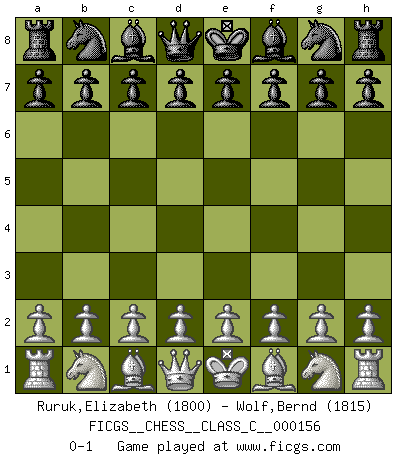Last move : 0-1 2010 October 13 21:48:45 [Event "FICGS__CHESS__CLASS_C__000156"] [Site "FICGS"] [Date "2010.09.03"] [Round "1"] [White "Ruruk,Elizabeth"] [Black "Wolf,Bernd"] [Result "0-1"] [WhiteElo "1800"] [BlackElo "1815"] 0-1 This chess game has been lost on time (started : 2010.09.03 15:31:55) Player Black won this chess game. Follow this game move after move (download)For surely of all the drugs in the world, Chess must be the most permanently pleasurable. (Assiac) Der Traum, für den ich lebe, ist der von einem freien Russland. Viele mögen sagen: Russland hat doch ein Parlament, einen gewählten Präsidenten. Aber ich spüre, dass in meiner Heimat die Angst wiederkehrt. Eine Angst, sich frei zu äußern, bestimmte Dinge zu tun (Garry Kasparov) Yo jugué Ajedrez con el y a veces le pude haber ganado solo que siempre devuelve su última jugada y juega la partida de manera diferente. (Mark Twain) Les Echecs mettent en conflit, non pas deux intelligences, mais deux volontés. (Lasker) The leaves of memory seemed to make a mournful rustling in the dark. (Henry Wadsworth Longfellow)