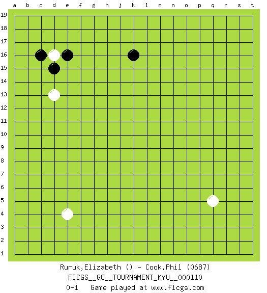 Last move : 0-1 2010 October 11 21:43:10 [Event "FICGS__GO__TOURNAMENT_KYU__000110"] [Site "FICGS"] [Date "2010.09.04"] [Round "1"] [Black "Ruruk,Elizabeth"] [White "Cook,Phil"] [Result "0-1"] [Rating 2 "0687"] 1.k16 d16 2.e16 e4 3.d15 q5 4.c16 d13 0-1 This go game has been lost on time (started : 2010.09.04 9:13:15) Here are the names of the openings (joseki) played in the four corners : Corner d16 : d16 e16 Hoshi (Hwajeom, Seongjeom, Xingwei`) 4-4 Point. The star or hoshi (4-4) point, emphasizing influence at the potential expense of territory. Corner d4 : e4 0-1 Takamoku (Gomok, Gaomu`) 5-4 Point. The takamoku (high) point (5-4). With its emphasis on influence, the 5-4 point complements the 4-4 (hoshi) point in creating an influence-oriented fuseki. Player White won this Go (weiqi, baduk) game. Follow this game move after move (download)The carpenter's square becomes ko. (Anonymous) There is no instance of a country having benefited from prolonged warfare. (Sun Tzu)