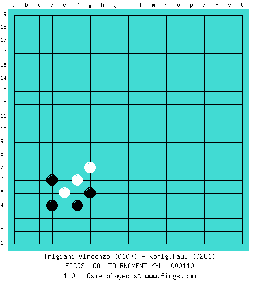Last move : 1-0 2010 October 13 21:48:45 [Event "FICGS__GO__TOURNAMENT_KYU__000110"] [Site "FICGS"] [Date "2010.09.04"] [Round "1"] [Black "Trigiani,Vincenzo"] [White "Konig,Paul"] [Result "1-0"] [Rating 1 "0107"] [Rating 2 "0281"] 1.d4 g7 2.f4 f6 3.d6 e5 4.g5 1-0 This go game has been lost on time (started : 2010.09.04 9:13:15) Here are the names of the openings (joseki) played in the four corners : Corner d4 : d4 g7 Hoshi (Hwajeom, Seongjeom, Xingwei`) 4-4 Point. The star or hoshi (4-4) point, emphasizing influence at the potential expense of territory. Player Black won this Go (weiqi, baduk) game. Follow this game move after move (download)Don't make a play adjacent to a cutting-point. (Anonymous) Optimism is a variety of information deficit. Sometimes especially true for correspondence chess games. (Michael Aigner)