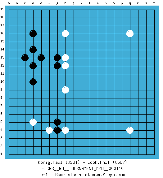 Last move : 0-1 2010 October 19 10:0:23 [Event "FICGS__GO__TOURNAMENT_KYU__000110 "] [Site "FICGS"] [Date "2010.09.04"] [Round "1"] [Black "Konig,Paul "] [White "Cook,Phil "] [Result "0-1"] [Rating 1 "0281"] [Rating 2 "0687"] 1.d16 d5 2.d10 q4 3.g4 d13 4.g13 f4 5.c13 q16 6.e13 h16 7.d12 h4 8.g5 h12 9.d14 h9 10.g12 h13 0-1 This go game has been lost on time (started : 2010.09.04 9:13:15) Here are the names of the openings (joseki) played in the four corners : Corner d4 : d5 g4Takamoku (Gomok, Gaomu`) 5-4 Point. The takamoku (high) point (5-4). With its emphasis on influence, the 5-4 point complements the 4-4 (hoshi) point in creating an influence-oriented fuseki. Corner d16 : d16 d13Hoshi (Hwajeom, Seongjeom, Xingwei`) 4-4 Point. The star or hoshi (4-4) point, emphasizing influence at the potential expense of territory.Niken Takagakari (Dukan Nop'dakeolch'im, E`r Gaojia, 2-Space High Approach). White 2 is a light approach move. Rarely played in even games, White 2 is typically employed in handicap games. Black continues with 6-4 or 3-10. In Korean Sunjang Baduk Black has a stone on 8-4. Player White won this Go (weiqi, baduk) game.Follow this game move after move (download ) Capture what you cut off. (Anonymous) Somewhere in the world there is an epigram for every dilemma. (Hendrik Willem van Loon)