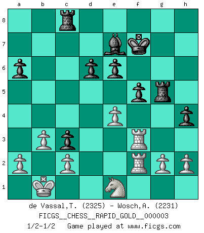 Last move : 1/2-1/2 2010 December 10 0:9:8 [Event "FICGS__CHESS__RAPID_GOLD__000003"] [Site "FICGS"] [Date "2010.09.04"] [Round "1"] [White "de Vassal,Thibault"] [Black "Wosch,Arkadiusz"] [Result "1/2-1/2"] [WhiteElo "2325"] [BlackElo "2231"] 1.e4 c5 2.Nf3 Nc6 3.d4 cxd4 4.Nxd4 Nf6 5.Nc3 d6 6.Bg5 e6 7.Qd2 a6 8.O-O-O Bd7 9.f4 b5 10.Bxf6 gxf6 11.Kb1 Qb6 12.Nxc6 Bxc6 13.f5 Qc5 14.Bd3 h5 15.Qe1 Be7 16.fxe6 fxe6 17.Ne2 Kf7 18.Nf4 Rag8 19.Rd2 h4 20.Rf1 Rg5 21.Be2 b4 22.b3 Bb5 23.Bxb5 Qxb5 24.Re2 Qc5 25.Rf3 Qd4 26.Rd2 Qe5 27.Rdf2 f5 28.Nd3 Qc3 29.Qxc3 bxc3 30.Ne1 Rc8 1/2-1/2 Sicilian defense Queenside Castling by player White (move 8) This chess game ended in a draw. Follow this game move after move (download)A bad plan is better than none at all. (Frank Marshall) Dein Körper muss in Topform sein. Dein Schach verfällt, wenn dein Körper verfällt. Der Körper kann nicht vom Geist getrennt werden. (Robert James Fischer) Aquel que teme a un Peón de Reina aislado, debería de retirarse del Ajedrez. (Siegbert Tarrasch) 'L'échange des dames est un coup dur pour les deux adversaires...' Un journaliste lors d'une partie du match Spassky-Fischer Now you put water in a cup, it becomes the cup; You put water into a bottle it becomes the bottle; You put it in a teapot it becomes the teapot. Water can flow or it can crash. Be water, my friend. (Bruce Lee)