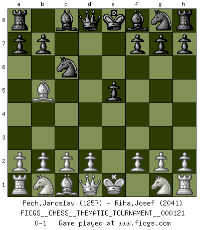 Last move : 0-1 2010 October 16 9:52:20 [Event "FICGS__CHESS__THEMATIC_TOURNAMENT__000121"] [Site "FICGS"] [Date "2010.09.06"] [Round "1"] [White "Pech,Jaroslav"] [Black "Riha,Josef"] [Result "0-1"] [WhiteElo "1257"] [BlackElo "2041"] 1.e4 d5 2.exd5 e5 3.Bb5+ c6 4.dxc6 Nxc6 0-1 This chess game has been lost on time (started : 2010.09.06 0:56:17) Scandinavian (centre counter) defense Player Black won this chess game. Follow this game move after move (download)Fischer sacrificed virtually everything most of us weakies (to use his term) value, respect, and cherish, for the sake of an artful, often beautiful board game, for the ambivalent privilege of being its greatest master. (Paul Kollar) Das Schachspiel übertrifft alle anderen Spiele so weit wie der Chimborasso einen Misthaufen. (Arthur Schopenhauer) Un sacrificio se refuta mucho mejor al aceptarlo. (Wilhelm Steinitz) La vie est comme un jeu d'échecs : nous esquissons un plan, mais celui-ci est tributaire de ce que daignent faire l'adversaire aux échecs et le destin dans la vie. (Arthur Schopenhauer) The intuitive mind is a sacred gift; the rational mind is a faithful servant. We have created a society that honors the servant but has forgotten the gift. (Albert Einstein)