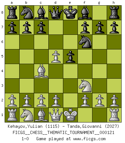 Last move : 1-0 2010 September 14 14:47:30 [Event "FICGS__CHESS__THEMATIC_TOURNAMENT__000121"] [Site "FICGS"] [Date "2010.09.06"] [Round "1"] [White "Kehayov,Yulian"] [Black "Tanda,Giovanni"] [Result "1-0"] [WhiteElo "1115"] [BlackElo "2027"] 1.e4 d5 2.exd5 e5 3.Bc4 Nf6 4.Nf3 1-0 Scandinavian (centre counter) defense Player White won this chess game. Follow this game move after move (download)Checkers is for tramps. (Paul Morphy) Capablanka war das größte Genie der Schachgeschichte! Aber denken sie nicht er habe nichts vom Schach verstanden. Er wusste nur soviel wie er wissen musste um seine Ziele zu erreichen. (Mikhail Moiseyevich Botvinik) Del Ajedrez se ha dicho que la vida no es lo suficientemente larga para él, pero eso es culpa de la vida, no del Ajedrez. (William Ewart Napier) Un footballeur joue avec ses pieds, parfois avec sa tête. Un joueur d'échecs ne joue qu'avec sa tête. Et quand il ne joue plus, il meurt. (Jacob Murray) The good fighters of old first put themselves beyond the possibility of defeat, and then waited for an opportunity of defeating the enemy. (Sun Tzu)