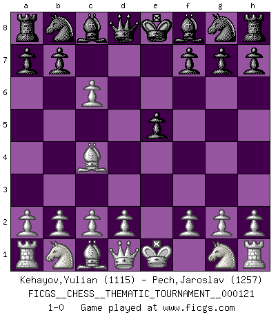 Last move : 1-0 2010 October 17 9:59:10 [Event "FICGS__CHESS__THEMATIC_TOURNAMENT__000121"] [Site "FICGS"] [Date "2010.09.06"] [Round "1"] [White "Kehayov,Yulian"] [Black "Pech,Jaroslav"] [Result "1-0"] [WhiteElo "1115"] [BlackElo "1257"] 1.e4 d5 2.exd5 e5 3.Bc4 c6 4.dxc6 1-0 This chess game has been lost on time (started : 2010.09.06 0:56:17) Scandinavian (centre counter) defense Player White won this chess game. Follow this game move after move (download)Chess is as much a mystery as women. (Purdy) Der 70jährige Viktor Kortschnoi: Die Rentenanstalt wollte mich zwingen in Rente zu gehen. Meine Frau erhält jetzt eine Pension- und ich zahle weiter in die Rentenkasse ein! (Viktor Kortschnoi) Un sacrificio se refuta mucho mejor al aceptarlo. (Wilhelm Steinitz) Toute estimation doit être constamment réévaluée. (Jacob Estrin) If things go wrong, don't go with them. (Roger Babson)