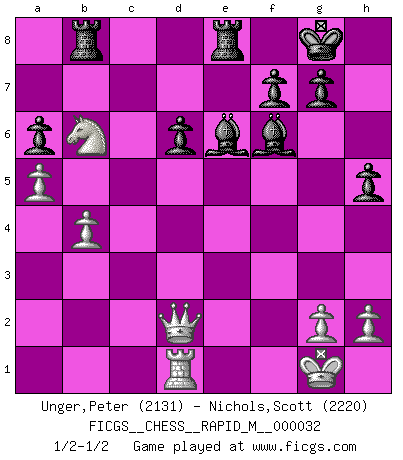 Last move : 1/2-1/2 2010 September 10 18:38:51 [Event "FICGS__CHESS__RAPID_M__000032"] [Site "FICGS"] [Date "2010.09.07"] [Round "1"] [White "Unger,Peter"] [Black "Nichols,Scott"] [Result "1/2-1/2"] [WhiteElo "2131"] [BlackElo "2220"] 1.e4 c5 2.Nf3 d6 3.d4 cxd4 4.Nxd4 Nf6 5.Nc3 a6 6.f3 e5 7.Nb3 Be6 8.Be3 Be7 9.Qd2 h5 10.Nd5 Nxd5 11.exd5 Bf5 12.Be2 Nd7 13.O-O O-O 14.Na5 Rb8 15.c4 Nf6 16.b4 Qd7 17.Rfd1 e4 18.c5 exf3 19.c6 bxc6 20.dxc6 fxe2 21.cxd7 exd1Q+ 22.Rxd1 Bxd7 23.Nc4 Be6 24.Nb6 Ng4 25.a4 Nxe3 26.Qxe3 Rfe8 27.a5 Bf6 28.Qd2 1/2-1/2 Sicilian : Najdorf Kingside Castling by player White (move 13) Kingside Castling by player Black (move 13) Promotion Queen by player Black (move 21) This chess game ended in a draw. Follow this game move after move (download)The boy (then a 12 year old boy named Anatoly Karpov) doesn't have a clue about Chess, and there's no future at all for him in this profession. (Mikhail Botvinnik) Frage des Reporters: -Worin besteht das Ziel von Gambiteröffnungen? Antwort: -Auf Kosten der Partie einen Ruf als Angriffspieler zu erwerben.- (Siegbert Tarrasch) Después de la respuesta de las negras a 1.e4 con 1..e5, se quedan siempre tratando de entrar dentro del juego. (Howard Staunton) Vous savez, camarade Pachman, je n'éprouve pas de plaisir à être ministre, je jouerais plutôt aux échecs comme vous, ou alors ferais une révolution au Venezuela. (Che Guevara à Ludek Pachman, 'Checkmate in Prague', 1975) We're missing something. (Gregory House, House M.D.)