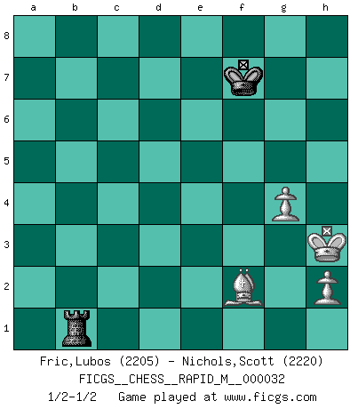 Last move : 1/2-1/2 2010 October 24 20:33:43 [Event "FICGS__CHESS__RAPID_M__000032"] [Site "FICGS"] [Date "2010.09.07"] [Round "1"] [White "Fric,Lubos"] [Black "Nichols,Scott"] [Result "1/2-1/2"] [WhiteElo "2205"] [BlackElo "2220"] 1.e4 c5 2.Nf3 d6 3.d4 cxd4 4.Nxd4 Nf6 5.Nc3 a6 6.Bg5 e6 7.f4 Nbd7 8.Qe2 Be7 9.O-O-O Qc7 10.g3 h6 11.Bh4 b5 12.Bg2 Rb8 13.a3 Bb7 14.Rhe1 O-O 15.e5 dxe5 16.fxe5 Bxa3 17.bxa3 Qxc3 18.Rd3 Qc4 19.Bxb7 Nc5 20.exf6 Nxd3+ 21.Qxd3 Qxd3 22.cxd3 Rxb7 23.fxg7 Kxg7 24.Rf1 Rc8+ 25.Kd2 a5 26.Bf6+ Kg6 27.Be5 Rc5 28.Nf3 b4 29.Bd4 Rd5 30.axb4 axb4 31.Ne5+ Kh7 32.Bb2 b3 33.d4 Kg8 34.Kd3 Kg7 35.Ra1 h5 36.Ra6 Kh7 37.Rc6 Rd8 38.Nc4 Kg6 39.Ne3 h4 40.g4 Kg5 41.d5 h3 42.Ke2 R7b8 43.dxe6 fxe6 44.Rxe6 Re8 45.Rd6 Kf4 46.Kf2 Rf8 47.Rd4+ Kg5 48.Kg3 Rbd8 49.Nd5 Rf1 50.Rd2 Rg1+ 51.Kxh3 Rd7 52.Bf6+ Kg6 53.Bh4 Rxd5 54.Rxd5 b2 55.Rd6+ Kf7 56.Rb6 b1Q 57.Rxb1 Rxb1 58.Bf2 1/2-1/2 Sicilian : Najdorf, 7.f4 Queenside Castling by player White (move 9) Kingside Castling by player Black (move 14) 10 pieces endgame at move 51 : White KRBNPP , Black KRRP WHITE : King + 1 Rook 1 Bishop 1 Knight 2 Pawns BLACK : King + 2 Rooks 1 Pawn 9 pieces endgame at move 53 : White KRBPP , Black KRRP WHITE : King + 1 Rook 1 Bishop 2 Pawns BLACK : King + 2 Rooks 1 Pawn 8 pieces endgame at move 54 : White KRBPP , Black KRP WHITE : King + 1 Rook 1 Bishop 2 Pawns BLACK : King + 1 Rook 1 Pawn Promotion Queen by player Black (move 56) 7 pieces endgame at move 57 : White KRBPP , Black KR WHITE : King + 1 Rook 1 Bishop 2 Pawns BLACK : King + 1 Rook 6 pieces endgame at move 57 : White KBPP , Black KR WHITE : King + 1 Bishop 2 Pawns BLACK : King + 1 Rook This chess game ended in a draw. Follow this game move after move (download)Could we look into the head of a Chess player, we should see there a whole world of feelings, images, ideas, emotion and passion. (Alfred Binet) Der zweitbeste Zug ist oft der einzig richtige. (Savielly Grigorievitsch Tartakower) El Ajedrez moderno está demasiado preocupado con cosas como la estructura de Peones. Olvidenlo, el Jaque Mate termina la partida. (Nigel Short) Shah mat. Le roi est mort. Cri de fierté d'un joueur venant de terrasser son adversaire, courtoisement, sans effusion de sang. The only thing that overcomes hard luck is hard work. (Harry Golden)