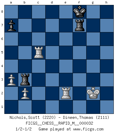 Last move : 1/2-1/2 2010 October 21 18:25:55 [Event "FICGS__CHESS__RAPID_M__000032"] [Site "FICGS"] [Date "2010.09.07"] [Round "1"] [White "Nichols,Scott"] [Black "Dineen,Thomas"] [Result "1/2-1/2"] [WhiteElo "2220"] [BlackElo "2111"] 1.d4 Nf6 2.c4 g6 3.Nc3 Bg7 4.e4 d6 5.Be2 O-O 6.h4 c5 7.d5 e6 8.h5 exd5 9.exd5 Re8 10.hxg6 hxg6 11.Kf1 Ne4 12.Nxe4 Rxe4 13.Nf3 Bg4 14.Bg5 Bf6 15.Qc2 Re8 16.Bf4 Na6 17.a3 Bg7 18.Bd2 Nb8 19.Bd3 Nd7 20.Ng5 Ne5 21.Be4 Bf6 22.Nh7 Bg7 23.Bg5 f6 24.Bh4 Bh5 25.f3 Qe7 26.Bg3 Qf7 27.Bf4 b5 28.cxb5 f5 29.Ng5 Qb7 30.Bxe5 Rxe5 31.Bd3 Bf6 32.Ne6 Bxf3 33.gxf3 Rxe6 34.Bxf5 Qxb5+ 35.Bd3 Qb7 36.Bxg6 Re7 37.Rb1 Rb8 38.Rh6 Qxd5 39.Bh7+ Kg7 40.Qg6+ Kf8 41.Qxf6+ Rf7 42.Qxd6+ Qxd6 43.Rxd6 Rxh7 44.Kg2 Rb3 45.Rd8+ Ke7 46.Rd2 Rf7 47.Re1+ Kf8 48.Re5 R7xf3 49.Rxc5 Rf7 50.Re2 1/2-1/2 King's Indian : 5.Be2 Kingside Castling by player Black (move 5) 10 pieces endgame at move 48 : White KRRPP , Black KRRPP WHITE : King + 2 Rooks 2 Pawns BLACK : King + 2 Rooks 2 Pawns 9 pieces endgame at move 49 : White KRRPP , Black KRRP WHITE : King + 2 Rooks 2 Pawns BLACK : King + 2 Rooks 1 Pawn This chess game ended in a draw. Follow this game move after move (download)War is the child of passion, passion is the child of narcissism and narcissism is the child. (...) Another game ? (Thibault de Vassal) Es war undenkbar für die Behörden, dass ein sowjetischer Großmeister auf diese Art und Weise [Fischer-Taimanov 6:0] verliert, ohne dass es eine politischer Erklärung dafür gäbe. (Mark Taimanov) Cualquier cambio de material en una posición debe venir por medio de un mate, una captura o promoción de Peón. (Purdy) Avec des compensations pour le matériel en plus... (Anonyme) A bird doesn't sing because it has an answer, it sings because it has a song. (Maya Angelou)
