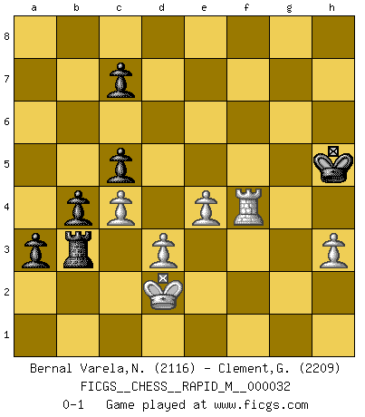 Last move : 0-1 2011 January 15 23:12:21 [Event "FICGS__CHESS__RAPID_M__000032"] [Site "FICGS"] [Date "2010.09.07"] [Round "1"] [White "Bernal Varela,Nelson"] [Black "Clement,George"] [Result "0-1"] [WhiteElo "2116"] [BlackElo "2209"] 1.e4 e5 2.Nf3 Nc6 3.Bb5 a6 4.Ba4 Nf6 5.O-O b5 6.Bb3 Bb7 7.d3 Be7 8.Nc3 d6 9.Nd5 Na5 10.Nxe7 Qxe7 11.Nh4 g6 12.Nf3 O-O 13.Bg5 Nxb3 14.axb3 Qe6 15.c4 Nd7 16.h3 Rfe8 17.Bd2 Nc5 18.Be3 b4 19.Re1 a5 20.Ra2 Kg7 21.Bxc5 dxc5 22.Qe2 Ra6 23.Rea1 Rea8 24.Nh2 Qd6 25.Qe3 Bc6 26.Qg5 Bd7 27.Nf1 Qd4 28.Nh2 f6 29.Qd2 Rd6 30.Rd1 Rb6 31.Rda1 Rba6 32.Qc2 Qd6 33.Nf1 f5 34.Nd2 f4 35.Nf3 Qf6 36.Qe2 h5 37.Ne1 Kh6 38.Nf3 g5 39.Nh2 Qg7 40.Kf1 g4 41.hxg4 hxg4 42.Ke1 Kg5 43.Nf1 Qh6 44.Nd2 Qh2 45.Qf1 Kg6 46.Kd1 g3 47.Kc2 Bg4 48.f3 Bd7 49.Qg1 Qxg1 50.Rxg1 Rh8 51.R2a1 Rh2 52.Nf1 Rh7 53.Nd2 Ra8 54.Rh1 R7h8 55.Rae1 Be6 56.Ref1 Rad8 57.Nb1 Kg7 58.Rxh8 Rxh8 59.Rg1 Rh2 60.Nd2 Bh3 61.gxh3 Kh6 62.Kd1 Kh5 63.Nf1 Rxb2 64.Nxg3+ fxg3 65.Rxg3 Rxb3 66.Kc2 Rc3+ 67.Kd2 a4 68.f4 exf4 69.Rg4 a3 70.Rxf4 Rb3 0-1 Ruy Lopez : Archangelsk (counterthrust) variation Kingside Castling by player White (move 5) Kingside Castling by player Black (move 12) Player Black won this chess game. Follow this game move after move (download)When you are lonely, when you feel yourself an alien in the world, play Chess. This will raise your spirits and be your counselor in war. (Aristotle) Schach ist wie eine schöne Frau, zu der wir ständig zurückkehren, gleichviel, wie oft sie uns zurückweist. (Anonymous) Debemos de asegurarnos de que el Ajedrez no se convierta en un lenguaje muerto, muy interesante, pero tan solo para un grupo muy pequeño. (Sytze Faber) On peut tirer plus d'utilité d'une partie perdue que de 100 parties gagnées. (Capablanca) I have opinions of my own - strong opinions - but I don't always agree with them. (George Bush)