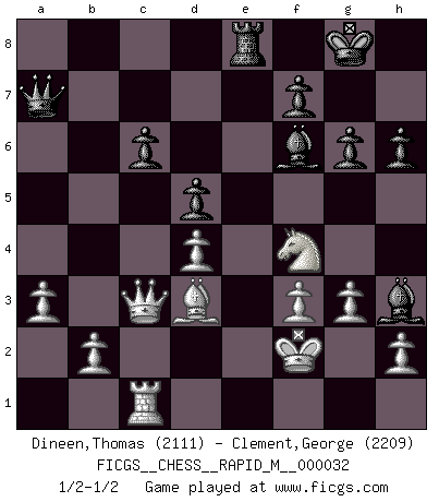 Last move : 1/2-1/2 2010 November 1 14:16:28 [Event "FICGS__CHESS__RAPID_M__000032"] [Site "FICGS"] [Date "2010.09.07"] [Round "1"] [White "Dineen,Thomas"] [Black "Clement,George"] [Result "1/2-1/2"] [WhiteElo "2111"] [BlackElo "2209"] 1.d4 d5 2.c4 e6 3.Nc3 Nf6 4.cxd5 exd5 5.Bg5 Be7 6.e3 O-O 7.Bd3 h6 8.Bh4 c6 9.Qc2 Re8 10.Nge2 a5 11.O-O b5 12.Rac1 Na6 13.Qd2 Nb4 14.Bb1 Na6 15.f3 a4 16.a3 b4 17.Nxa4 Nb8 18.Bxf6 Bxf6 19.Qxb4 Rxe3 20.Rfe1 Nd7 21.Qd2 Re6 22.Nec3 Rxe1+ 23.Rxe1 Nf8 24.Nc5 Ne6 25.Nxe6 Bxe6 26.Ne2 Qb6 27.Kf1 Bc8 28.Bd3 Bd7 29.Rb1 Qc7 30.g3 Bh3+ 31.Kf2 Qa7 32.Qc3 Re8 33.Re1 Qe7 34.Qd2 Qa7 35.Qb4 g6 36.Rc1 Bg5 37.Nf4 Be7 38.Qc3 Bf6 39.Ne2 Bg5 40.Nf4 Bf6 1/2-1/2 QGD : Exchange, positional line Kingside Castling by player Black (move 6) Kingside Castling by player White (move 11) This chess game ended in a draw. Follow this game move after move (download)Help your pieces so they can help you. (Paul Morphy) Wenn du auf das Glück wartest, wird das Leben ziemlich langweilig. (Mikhail Nekhemyevich Tal) De eso se trata el Ajedrez. Un día le das una lección a tu oponente y al día siguiente el te da una a tí. (Bobby Fischer) Les écrivains ont utilisé les échecs pour analyser les côtés extrêmes de la nature humaine. Dans ce cadre, les échecs offrent un champ d'expérimentation idéal. Mais on pourrait faire la même chose avec la peinture. Et là, en vous référant à Van Gogh, vous ne tirerez pas de conclusion définitive sur les peintres. (Gary Kasparov) Life is like a play: it's not the length but the excellence of the acting that matters. (Seneca)