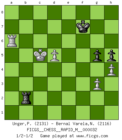 Last move : 1/2-1/2 2010 November 29 13:58:25 [Event "FICGS__CHESS__RAPID_M__000032"] [Site "FICGS"] [Date "2010.09.07"] [Round "1"] [White "Unger,Peter"] [Black "Bernal Varela,Nelson"] [Result "1/2-1/2"] [WhiteElo "2131"] [BlackElo "2116"] 1.e4 c5 2.Nf3 d6 3.d4 cxd4 4.Nxd4 Nf6 5.Nc3 a6 6.f3 e5 7.Nb3 Be6 8.Be3 Nbd7 9.Qd2 b5 10.O-O-O b4 11.Nd5 Bxd5 12.exd5 a5 13.Bb5 a4 14.Na1 a3 15.Nb3 Be7 16.Qxb4 axb2+ 17.Kxb2 O-O 18.a4 Qc7 19.Rhe1 Rfc8 20.c4 Rcb8 21.Qc3 h6 22.a5 Bd8 23.a6 Nb6 24.Qd3 Nfd7 25.Bf2 Qc8 26.Ra1 f5 27.Qc2 e4 28.Bd4 Bf6 29.Bxf6 Nxf6 30.fxe4 fxe4 31.Rxe4 Nxe4 32.Qxe4 Qf8 33.Kc3 Qf2 34.Nd4 Nxc4 35.Qc2 Qe3+ 36.Qd3 Qxd3+ 37.Kxd3 Ne5+ 38.Kc3 g6 39.Ra3 Rc8+ 40.Nc6 Nd7 41.Kb4 Kg7 42.Re3 Nc5 43.Ka5 Kf8 44.Re2 h5 45.g3 Nb3+ 46.Kb6 Rcb8+ 47.Nxb8 Rxb8+ 48.Kc6 Nd4+ 49.Kxd6 Nxb5+ 50.Kc5 Kf7 51.Re1 g5 52.Re6 Nc7 53.Rc6 Nxa6+ 54.Rxa6 Rb2 55.h4 1/2-1/2 Sicilian : Najdorf Queenside Castling by player White (move 10) Kingside Castling by player Black (move 17) 10 pieces endgame at move 53 : White KRPPP , Black KRNPP WHITE : King + 1 Rook 3 Pawns BLACK : King + 1 Rook 1 Knight 2 Pawns 9 pieces endgame at move 54 : White KRPPP , Black KRPP WHITE : King + 1 Rook 3 Pawns BLACK : King + 1 Rook 2 Pawns This chess game ended in a draw. Follow this game move after move (download)If your opponent cannot do anything active, then don't rush the position; instead you should let him sit there, suffer, and beg you for a draw. (Jeremy Silman) Ich bin der einzige Schachspieler, der sich während der Vorbereitungen zum Turnier verletzt hat. (Woody Allen) No hay un Gran Maestro de Ajedrez que sea normal; solo se diferencían ellos por la magnitud de su locura. (Viktor Korchnoi) Toutes les manuvres exécutées sur une colonne ouverte ont pour but ultime l'intrusion définitive sur la septième ou la huitième rangée, en plein cur de la position ennemie. (Aaron Nimzovitch) You can't play chess if you're groggy from pills. (Anatoly Karpov)