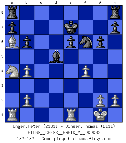 Last move : 1/2-1/2 2010 September 13 13:38:42 [Event "FICGS__CHESS__RAPID_M__000032"] [Site "FICGS"] [Date "2010.09.07"] [Round "1"] [White "Unger,Peter"] [Black "Dineen,Thomas"] [Result "1/2-1/2"] [WhiteElo "2131"] [BlackElo "2111"] 1.e4 e6 2.d4 d5 3.Nc3 Nf6 4.e5 Nfd7 5.f4 c5 6.Nf3 Nc6 7.Be3 Qb6 8.a3 cxd4 9.Nxd4 Bc5 10.Na4 Qa5+ 11.c3 Bxd4 12.Bxd4 Nxd4 13.Qxd4 b6 14.Qb4 Qxb4 15.axb4 Ke7 16.Bb5 Bb7 17.O-O f6 18.exf6+ Nxf6 19.Rfe1 g6 20.c4 dxc4 21.Bxc4 Bd5 22.Ba6 1/2-1/2 French : Steinitz, Boleslavsky variation Kingside Castling by player White (move 17) This chess game ended in a draw. Follow this game move after move (download)My God, Bobby Fischer plays so simply. (Alexei Suetin) Auf jeden Fall musst du zuerst Rechtsanwalt werden, damit du deine eigenen Interessen und die deiner Familie vertreten kannst. [Brief an seinen Sohn] (José Raúl Capablanca) Si el ingenio solamente fuese necesario para lucirse, las mujeres serían las mejores jugadoras de Ajedrez del mundo. (Albin) Les Echecs représentent une sphère d'idées créatrices basée sur la volonté des deux protagonistes. (Smyslov) Fortune favours the audacious. (Desiderius Erasmus)