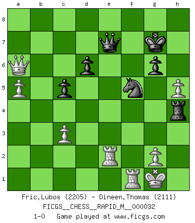 Last move : 1-0 2011 February 18 19:1:40 [Event "FICGS__CHESS__RAPID_M__000032"] [Site "FICGS"] [Date "2010.09.07"] [Round "1"] [White "Fric,Lubos"] [Black "Dineen,Thomas"] [Result "1-0"] [WhiteElo "2205"] [BlackElo "2111"] 1.d4 Nf6 2.c4 e6 3.Nc3 Bb4 4.f3 c5 5.d5 O-O 6.e4 Re8 7.Nge2 d6 8.a3 Ba5 9.dxe6 fxe6 10.Ng3 Bxc3+ 11.bxc3 Qa5 12.Qc2 Bd7 13.Bf4 Ba4 14.Qd2 Nc6 15.Rb1 Rab8 16.Be2 Ne5 17.Bg5 Nfd7 18.f4 Nf7 19.Bh4 Bc6 20.O-O a6 21.Rbd1 Qc7 22.Rf2 b5 23.Rdf1 bxc4 24.Bh5 g6 25.Be2 Qb7 26.f5 exf5 27.exf5 Nde5 28.fxg6 hxg6 29.Bf6 Re6 30.Qf4 Bd5 31.Qh4 Rxf6 32.Qxf6 Re8 33.h4 Re6 34.Qf4 Qe7 35.Ne4 Bxe4 36.Qxe4 Nh6 37.Bxc4 Nxc4 38.Qxc4 Kg7 39.Qxa6 Re1 40.a4 Nf5 41.a5 Re4 42.h5 Rh4 43.Re2 1-0 Nimzo-Indian : Kmoch variation Kingside Castling by player Black (move 5) Kingside Castling by player White (move 20) Player White won this chess game. Follow this game move after move (download)Chess is like life. (Boris Spassky) Schach ist ein Teil der Kultur, und wenn es mit der Kultur abwärts geht, geht es auch mit dem Schach abwärts. (Mikhail Moiseyevich Botvinik) Aún el Rey más flojo huye despavorido ante la amenaza de un Jaque doble. (Aaron Nimzowitsch) A chaque perte on perd un peu de soi. (Joël Lautier) To err is human, to shift the blame on someone else is tactical. (Mladen Jankovic)