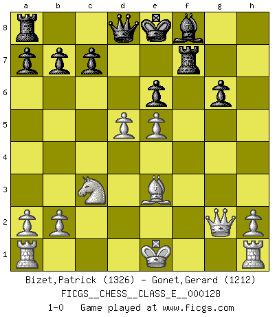 Last move : 1-0 2010 September 13 21:52:11 [Event "FICGS__CHESS__CLASS_E__000128"] [Site "FICGS"] [Date "2010.09.07"] [Round "1"] [White "Bizet,Patrick"] [Black "Gonet,Gerard"] [Result "1-0"] [WhiteElo "1326"] [BlackElo "1212"] 1.e4 Nc6 2.d4 d5 3.e5 f6 4.f4 Nh6 5.Nf3 Bf5 6.c4 e6 7.Bd3 Be4 8.Nc3 Bxf3 9.gxf3 Nxd4 10.Bxh7 Nxf3+ 11.Qxf3 Rxh7 12.cxd5 g6 13.Be3 fxe5 14.fxe5 Rf7 15.Qg2 Nf5 16.Bg5 Ne3 17.Bxe3 1-0 KP : Nimzovich defense Player White won this chess game. Follow this game move after move (download)The passed pawn is a criminal, who should be kept under lock and key. Mild measures, such as police surveillance, are not sufficient. (Nimzovitch) Ich hatte meine größten Erfolge, als ich 47 Jahre alt war. Kasparow war noch nicht mal 42 und hat das Schach schon im Stich gelassen. (Viktor Kortschnoi) El juego de Fischer siempre fue nítido, racional y brillante. Uno de los mejores por siempre. (Dave Regis) Shah mat. Le roi est mort. Cri de fierté d'un joueur venant de terrasser son adversaire, courtoisement, sans effusion de sang. In my experience, there's no such thing as luck. (Obi-Wan Kenobi in Star Wars ep.4)