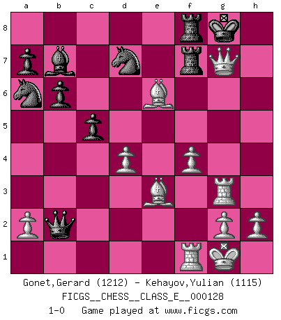 Last move : 1-0 2010 September 9 22:51:8 [Event "FICGS__CHESS__CLASS_E__000128"] [Site "FICGS"] [Date "2010.09.07"] [Round "1"] [White "Gonet,Gerard"] [Black "Kehayov,Yulian"] [Result "1-0"] [WhiteElo "1212"] [BlackElo "1115"] 1.f4 d5 2.c4 dxc4 3.e4 e6 4.Bxc4 Qd4 5.d3 Bb4+ 6.Nd2 Nf6 7.Ngf3 Qd8 8.O-O O-O 9.e5 Nfd7 10.Ne4 b6 11.Nfg5 h6 12.Qh5 Be7 13.Rf3 Nc5 14.Nf6+ Bxf6 15.exf6 Qxf6 16.Be3 Bb7 17.Rg3 Nbd7 18.Rf1 Qxb2 19.d4 Na6 20.Nxf7 Rxf7 21.Bxe6 Raf8 22.Qxh6 c5 23.Qxg7+ 1-0 Mujannah Opening Kingside Castling by player White (move 8) Kingside Castling by player Black (move 8) Player White won this chess game. Follow this game move after move (download)Fischer Chess play was always razor-sharp, rational and brilliant. One of the best ever. (Dave Regis) Der Bart als Geschlechtszeichen mitten im Gesicht ist obszön. Daher gefällt er den Weibern. [Zugegeben, kein Schachzitat, aber unglaublich originell] (Arthur Schopenhauer) El Ajedrez es la vida. (Bobby Fischer) J'apprécie les joueurs d'est-indienne, c'est grâce à eux que je nourris ma famille depuis tant d'années. (Petrosian) Never risk one's whole fortune unless supported by one's entire army. (Niccolo Machiavelli)