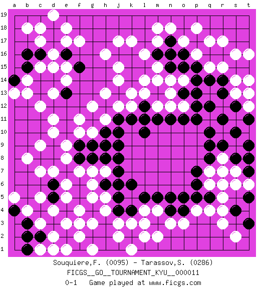 Last move : 0-1 2007 January 1 12:36:37 [Event "FICGS__GO__TOURNAMENT_KYU__000011"] [Site "FICGS"] [Date "2006.11.22"] [Round "1"] [Black "Souquiere,Florence"] [White "Tarassov,Sergey"] [Result "0-1"] [Rating 1 "0095"] [Rating 2 "0286"] 1.d17 q4 2.r16 d4 3.q10 d15 4.k16 d11 5.r7 o3 6.n4 n3 7.h3 f3 8.r13 k3 9.g2 d7 10.k4 j3 11.j4 m4 12.k2 l2 13.l3 j2 14.m3 l4 15.l5 m2 16.m5 f17 17.p5 j17 18.n16 q6 19.p7 r6 20.q5 r5 21.c16 c15 22.j16 h16 23.o5 p4 24.h2 f2 25.j1 k1 26.h1 k17 27.g4 f4 28.f5 e5 29.e7 e8 30.f8 e9 31.f9 f11 32.g11 h13 33.j13 h11 34.h10 g10 35.g9 g12 36.j11 j12 37.j10 k12 38.l12 f10 39.k11 k13 40.l13 j14 41.k14 l14 42.p6 q7 43.q8 s7 44.o4 r3 45.q9 m14 46.k15 l16 47.l15 m15 48.n15 n14 49.m16 j15 50.m13 o12 51.o13 n13 52.p12 l11 53.o11 n12 54.l10 m12 55.m11 f7 56.l12 g7 57.h9 g5 58.f6 h5 59.k6 h4 60.j7 h7 61.j8 r8 62.r9 s9 63.s10 o14 64.o15 m17 65.n17 m18 66.p14 n18 67.h6 g6 68.j6 o17 69.g8 g3 70.f1 e1 71.p15 q17 72.p11 r17 73.p17 p18 74.n11 s16 75.o16 p16 76.p13 r15 77.e2 g1 78.l11 s14 79.d8 e6 80.j9 s13 81.d9 d10 82.c8 c7 83.d6 b8 84.j5 c9 85.q16 q15 86.d1 d2 87.q14 r12 88.b15 b14 89.b16 d16 90.e16 e17 91.s12 s11 92.r11 t12 93.q12 t10 94.c2 c1 95.d18 e18 96.d3 c3 97.b2 e3 98.s12 b18 99.t11 c18 100.t9 t13 101.s8 r7 102.t7 t6 103.t8 d19 104.m3 l3 105.c14 b13 106.d5 c5 107.r14 c17 108.t5 s6 109.b3 b4 110.s4 r4 111.t15 t16 112.d14 e15 113.b1 d1 114.f15 e14 115.e13 d13 116.s15 t14 117.h8 l13 118.c13 c12 119.t3 s2 120.n5 pass 121.a14 a13 122.a4 a5 0-1 Here are the names of the openings (joseki) played in the four corners : Corner d16 : d17 d15 Komoku (Somok, Xiao~mu`) 3-4 Point. The komoku (3-4) point is the traditional corner enclosure move.. Ikken Takagakari (Hankan Nop'dakeolch'im, Yi Gaogua`jiao~, 1-Space High Approach). The 5-4 approach move has become more popular in modern times, as modern Go emphasizes speed and influence. Corner q4 : q4 r7 Hoshi (Hwajeom, Seongjeom, Xingwei`) 4-4 Point. The star or hoshi (4-4) point, emphasizing influence at the potential expense of territory. Nikken Kakari (Dukan Keolch'im, E`r Gua`jiao~, 2-Space Low Approach). White typically answers by 7-3 or 3-5 (which is not joseki). Corner d4 : d4 h3 Hoshi (Hwajeom, Seongjeom, Xingwei`) 4-4 Point. The star or hoshi (4-4) point, emphasizing influence at the potential expense of territory. Player White won this Go (weiqi, baduk) game. Follow this game move after move (download)If you cannot succeed, then die gloriously. (Chinese proverb) Being number two sucks. (Andre Agassi)