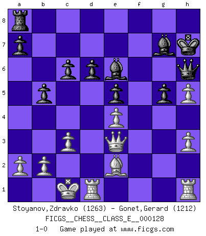 Last move : 1-0 2010 September 12 17:34:37 [Event "FICGS__CHESS__CLASS_E__000128"] [Site "FICGS"] [Date "2010.09.07"] [Round "1"] [White "Stoyanov,Zdravko"] [Black "Gonet,Gerard"] [Result "1-0"] [WhiteElo "1263"] [BlackElo "1212"] 1.e4 Nc6 2.Nf3 Nf6 3.d3 d6 4.Bg5 e5 5.h3 h6 6.Bh4 g5 7.Bg3 Bg7 8.Be2 Nh5 9.Nh2 Nxg3 10.fxg3 O-O 11.Nc3 f5 12.g4 fxe4 13.dxe4 Ne7 14.Nd5 Ng6 15.c3 c6 16.Ne3 Nh4 17.Bc4+ Kh7 18.Qc2 b5 19.Bd3 Be6 20.g3 Nf3+ 21.Nxf3 Rxf3 22.Qd2 Rxg3 23.Qf2 Rxe3+ 24.Qxe3 h5 25.gxh5 Qf6 26.O-O-O Qh6 27.Be2 1-0 KP : Nimzovich defense Kingside Castling by player Black (move 10) Queenside Castling by player White (move 26) Player White won this chess game. Follow this game move after move (download)For surely of all the drugs in the world, Chess must be the most permanently pleasurable. (Assiac) Schach wird sich dank seiner hohen kulturellen Tradition immer durchsetzen. In näherer Zukunft womöglich sogar als Gegenreaktion auf die maßlose Reizüberflutung im Freizeit- und Spielbereich. (Garry Kasparov) Muchos se han convertido en Maestros de Ajedrez, nadie se ha convertido en el Maestro del Ajedrez. (Siegbert Tarrasch) La conception d'un plan est le processus par lequel un joueur exploite les avantages de sa position tout en s'efforçant d'en réduire au minimum les inconvénients. Afin de garantir le succès, un plan doit toujours se fonder sur un diagnostic objectif des particularités d'une position. La conception d'un plan est d'autant plus difficile que la position est équilibrée, et grandement facilitée lorsqu'il n'existe qu'un seul plan susceptible de répondre aux exigences de la position. (Harry Golombek) Creativity is inventing, experimenting, growing, taking risks, breaking rules, making mistakes, and having fun. (Mary Lou Cook)