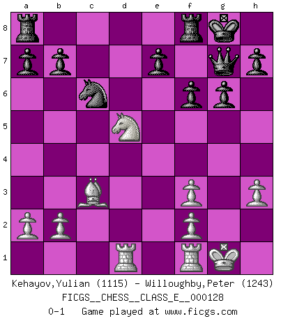 Last move : 0-1 2010 September 28 21:50:51 [Event "FICGS__CHESS__CLASS_E__000128"] [Site "FICGS"] [Date "2010.09.07"] [Round "1"] [White "Kehayov,Yulian"] [Black "Willoughby,Peter"] [Result "0-1"] [WhiteElo "1115"] [BlackElo "1243"] 1.e3 d5 2.d4 g6 3.Nf3 Bg7 4.Bd3 c5 5.dxc5 Qa5+ 6.Bd2 Qxc5 7.c3 Bg4 8.h3 Bd7 9.O-O Nf6 10.Qe2 O-O 11.e4 dxe4 12.Bxe4 Nxe4 13.Qxe4 Bc6 14.Qd4 Bxd4 15.cxd4 Qb6 16.Nc3 Bxf3 17.gxf3 Qxd4 18.Rad1 Qg7 19.Nd5 Nc6 20.Bc3 f6 0-1 Van't Kruijs Opening Kingside Castling by player White (move 9) Kingside Castling by player Black (move 10) Player Black won this chess game. Follow this game move after move (download)Chess is played with the mind and not with the hands ! (Renaud and Kahn) Mein Name ist Rustam Kamsky. Sie haben meinen Sohn belästigt. Bereiten Sie sich aufs Sterben vor. (Rustam Kamsky) El Ajedrez hace al hombre ser mas sabio y ver mas claro. (Vladimir Putin) Des points faibles ou des trous dans la position de l'adversaire doivent être occupés par des pièces et non pas par des pions. (Siegbert Tarrasch) Work expands to fill the time available. (C. Northcote Parkinson, in Parkinson's Laws)