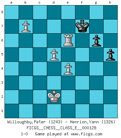 Last move : 1-0 2010 October 13 8:33:49 [Event "FICGS__CHESS__CLASS_E__000128"] [Site "FICGS"] [Date "2010.09.07"] [Round "1"] [White "Willoughby,Peter"] [Black "Henrion,Yann"] [Result "1-0"] [WhiteElo "1243"] [BlackElo "1326"] 1.d4 d5 2.Nf3 Nc6 3.e3 Nf6 4.Bb5 Bd7 5.O-O g6 6.Be2 Bg7 7.c4 O-O 8.cxd5 Nxd5 9.Nc3 Nxc3 10.bxc3 e5 11.d5 Ne7 12.e4 Bg4 13.a4 f5 14.Bg5 f4 15.Nd2 Bxe2 16.Qxe2 h6 17.Bxe7 Qxe7 18.a5 Qc5 19.Qc4 Qxc4 20.Nxc4 a6 21.f3 Rf7 22.Nd2 Rf6 23.c4 b6 24.Rfb1 Bf8 25.axb6 Bc5+ 26.Kf1 cxb6 27.g3 fxg3 28.hxg3 Be3 29.Ke2 Bxd2 30.Kxd2 Rxf3 31.Rxb6 Rxg3 32.R1xa6 Rxa6 33.Rxa6 Kf7 34.c5 Rb3 35.Re6 h5 36.Rxe5 Kf6 37.Re6+ Kf7 38.c6 Rb7 39.cxb7 1-0 Queen's pawn game, Chigorin variation Kingside Castling by player White (move 5) Kingside Castling by player Black (move 7) 10 pieces endgame at move 33 : White KRPPP , Black KRPPP WHITE : King + 1 Rook 3 Pawns BLACK : King + 1 Rook 3 Pawns 9 pieces endgame at move 36 : White KRPPP , Black KRPP WHITE : King + 1 Rook 3 Pawns BLACK : King + 1 Rook 2 Pawns 8 pieces endgame at move 39 : White KRPPP , Black KPP WHITE : King + 1 Rook 3 Pawns BLACK : King + 2 Pawns Player White won this chess game. Follow this game move after move (download)An attack on the wing should be met by play in the center. (Nimzovitch) Garry Kasparov war erst in der Großmeister-Organisation GMA, dann in der Profischach-Vereinigung PCA, zum Schluss kehrte er wieder in den Schoß der FIDE zurück. Aber gut, manche Leute sind flexibel (Viswanathan Anand) Ciertamente, de todas la drogas del mundo, el Ajedrez debe ser el mas placentero permamentemente. (Assiac) Les Echecs sont affaire de jugement sensible. Savoir quand frapper et quand esquiver. (Fischer) The modern world has divided itself into Conservatives and Progressives. The business of Progressives is to go on making mistakes. The business of the Conservatives is to prevent the mistakes from being corrected. (G.K. Chesterton)