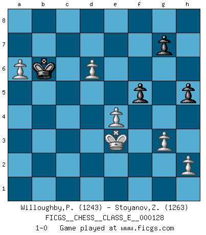 Last move : 1-0 2010 October 3 16:44:46 [Event "FICGS__CHESS__CLASS_E__000128"] [Site "FICGS"] [Date "2010.09.07"] [Round "1"] [White "Willoughby,Peter"] [Black "Stoyanov,Zdravko"] [Result "1-0"] [WhiteElo "1243"] [BlackElo "1263"] 1.d4 d5 2.Nf3 Bg4 3.Ne5 Bf5 4.e3 f6 5.Nf3 e6 6.Be2 Bd6 7.b3 Ne7 8.O-O O-O 9.Bb2 Nbc6 10.Nc3 Nb4 11.Rc1 Qe8 12.a3 Nbc6 13.Bd3 Qg6 14.Bxf5 Nxf5 15.Qd3 Nce7 16.Nb5 c6 17.Nxd6 Nxd6 18.Qxg6 Nxg6 19.c4 dxc4 20.bxc4 b6 21.c5 bxc5 22.Rxc5 Rfc8 23.Nd2 Nb7 24.Rc4 e5 25.Nf3 e4 26.Nd2 Na5 27.Rc5 Nb7 28.Rc4 Nd6 29.Rc5 Rab8 30.Ba1 Ne7 31.Nc4 Nxc4 32.Rxc4 Rb3 33.a4 Nd5 34.Rfc1 Ne7 35.R1c3 Rcb8 36.f3 Rxc3 37.Bxc3 Rc8 38.fxe4 a6 39.Bb4 Ng6 40.g3 Re8 41.Rxc6 Rxe4 42.Kf2 h5 43.Rxa6 Kf7 44.Ra8 Ne7 45.Ra7 Ke8 46.Rxe7+ Rxe7 47.Bxe7 Kxe7 48.e4 Kd6 49.Ke3 Kc6 50.d5+ Kc5 51.a5 f5 52.a6 Kb6 53.d6 1-0 Queen's pawn game Kingside Castling by player White (move 8) Kingside Castling by player Black (move 8) 10 pieces endgame at move 47 : White KPPPPP , Black KPPP WHITE : King + 5 Pawns BLACK : King + 3 Pawns Player White won this chess game. Follow this game move after move (download)A good player is always lucky. (Jose Raul Capablanca) Über Kasparov: Es ist offensichtlich, daß er in einem totalitären Staat aufwuchs und deshalb zu diktatorischen Zügen neigt. (Viktor Kortschnoi) El Ajedrez es tan interesante por sí solo, que no es necesario un interés monetario para persuadir a una persona a que lo practique; por lo tanto, nunca se juega por dinero. (Benjamin Franklin) Il n'y a pas de prix trop élevé au scalp de l'ennemi. (Koblentz) We're missing something. (Gregory House, House M.D.)
