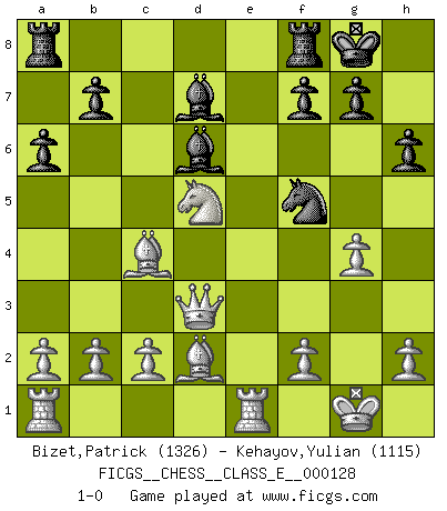 Last move : 1-0 2010 September 27 20:25:35 [Event "FICGS__CHESS__CLASS_E__000128"] [Site "FICGS"] [Date "2010.09.07"] [Round "1"] [White "Bizet,Patrick"] [Black "Kehayov,Yulian"] [Result "1-0"] [WhiteElo "1326"] [BlackElo "1115"] 1.e4 e5 2.Nf3 Nc6 3.Bb5 Nge7 4.d4 exd4 5.Nxd4 Nxd4 6.Qxd4 a6 7.Bc4 d5 8.exd5 Nf5 9.Qd3 Bd6 10.O-O O-O 11.Nc3 c6 12.Re1 Qg5 13.Bxg5 h6 14.Bd2 cxd5 15.Nxd5 Bd7 16.g4 1-0 Ruy Lopez : Cozio defense Kingside Castling by player White (move 10) Kingside Castling by player Black (move 10) Player White won this chess game. Follow this game move after move (download)Chess is above all, a fight ! (Emanuel Lasker) Wenn Schach ein enormer Dschungel ist, der seine Myriaden von Geheimnissen nicht preisgeben will, dann sind Computer die Kettensägen einer gewaltigen ökologisch unsensiblen Nutzholzfirma. (Nigel Short) Los Peones son nacidos libres, y aún así, se encuentran encadenados por todos lados. (Rick Kennedy) Ce qui caractérise les parties de combat, c'est que si le défenseur a constamment de difficiles problèmes à résoudre, l'attaquant doit chercher sans relâche de nouvelles possibilités d'attaque. (Koblentz) Waiting for chance ? Play in casinos. (FICGS proverb)