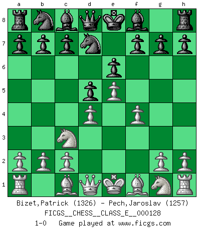 Last move : 1-0 2010 October 19 22:0:3 [Event "FICGS__CHESS__CLASS_E__000128"] [Site "FICGS"] [Date "2010.09.07"] [Round "1"] [White "Bizet,Patrick"] [Black "Pech,Jaroslav"] [Result "1-0"] [WhiteElo "1326"] [BlackElo "1257"] 1.e4 e6 2.d4 d5 3.Nc3 Nf6 4.e5 Nfd7 5.f4 1-0 This chess game has been lost on time (started : 2010.09.07 18:53:2) French : Steinitz variation Player White won this chess game. Follow this game move after move (download)Chess is not like life... it has rules ! (Mark Pasternak) Man wirke der falschen Auffassung entgegen, als ob jeder Zug Unmittelbares zu leisten habe; auch Werte- und Ruhezüge haben ihre Existenzberechtigung. (Aaron Nimzowitsch) El Ajedrez es sobre todo, ¡una pelea!. (Emanuel Lasker) Il (Jacob Murray) ne joue pas pour le bon coup, mais pour le meilleur. (Eloi Relange) Ah, beer! The cause of, and the solution to, all of life's problems. (Homer Simpson)