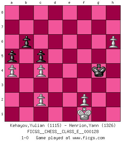 Last move : 1-0 2010 October 10 22:36:35 [Event "FICGS__CHESS__CLASS_E__000128"] [Site "FICGS"] [Date "2010.09.07"] [Round "1"] [White "Kehayov,Yulian"] [Black "Henrion,Yann"] [Result "1-0"] [WhiteElo "1115"] [BlackElo "1326"] 1.e4 e5 2.d4 exd4 3.Qxd4 d6 4.Nf3 Nc6 5.Qd1 Bg4 6.Be2 Nf6 7.O-O g6 8.Nc3 Bg7 9.h3 a6 10.Bg5 h6 11.Bxf6 Bxf6 12.hxg4 Bxc3 13.bxc3 Ne5 14.Nxe5 dxe5 15.Qxd8+ Rxd8 16.Rad1 f5 17.Rxd8+ Kxd8 18.Rd1+ Ke7 19.exf5 gxf5 20.gxf5 Rf8 21.Bf3 b6 22.g4 c5 23.c4 a5 24.a4 Rg8 25.Kf1 e4 26.Re1 Kf6 27.Rxe4 h5 28.gxh5 Kxf5 29.Rg4 Rxg4 30.Bxg4+ Kxg4 31.h6 1-0 Centre game Kingside Castling by player White (move 7) 10 pieces endgame at move 30 : White KPPPPP , Black KPPP WHITE : King + 5 Pawns BLACK : King + 3 Pawns Player White won this chess game. Follow this game move after move (download)The hallmark of the artist is simplicity. (Larry Evans) Kostenjuk hat keinen Sexappeal. (Loek van Wely) Hasta este punto, las blancas han seguido un análisis bien conocido. Pero ahora el hace un error fatal: empieza a usar su propia cabeza. (Siegbert Tarrasch) Les échecs sont plus proches de l'art de l'assassinat que de l'art de la guerre. (Arturo Perez-Reverte) All war is based on deception. (Sun Tzu)