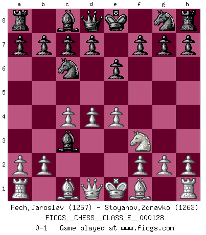 Last move : 0-1 2010 October 19 10:0:23 [Event "FICGS__CHESS__CLASS_E__000128"] [Site "FICGS"] [Date "2010.09.07"] [Round "1"] [White "Pech,Jaroslav"] [Black "Stoyanov,Zdravko"] [Result "0-1"] [WhiteElo "1257"] [BlackElo "1263"] 1.c4 Nc6 2.Nc3 e6 3.d4 Be7 4.e4 Bb4 5.Nf3 Bxc3+ 0-1 This chess game has been lost on time (started : 2010.09.07 18:53:2) English Opening Player Black won this chess game. Follow this game move after move (download)All that matters on the Chessboard is good moves. (Bobby Fischer) Ich tröste mich mit dem Vergnügen, daß Schachfans, Zuschauer und Leser glücklich sind, wenn ein Großmeister etwas riskiert, statt nur Klötzchen zu schieben. (Mikhail Nekhemyevich Tal) Aquel que ve no otra dirección en el juego que la de dar Jaque Mate a su oponente, nunca será un buen jugador de Ajedrez. (Euwe) Horreur, mais aussi harmonie suprême : qu'y avait-il en effet au monde en dehors des échecs ? Le brouillard, l'inconnu, le non-être... (Vladimir Nabokov) The human is the only animal species whose members are able to talk themselves into difficulties that would not otherwise exist. (Wendell Johnson)