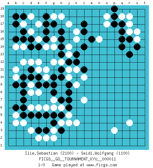 Last move : 1-0 2007 April 6 20:32:28 [Event "FICGS__GO__TOURNAMENT_KYU__000011"] [Site "FICGS"] [Date "2006.11.22"] [Round "1"] [Black "Ilie,Sebastian"] [White "Seidl,Wolfgang"] [Result "1-0"] [Rating 1 "2100"] [Rating 2 "1100"] 1.q16 d3 2.c16 r4 3.c5 c4 4.d5 g3 5.c10 o17 6.l17 r17 7.q17 r16 8.q15 q18 9.p18 r18 10.p17 r14 11.q14 o18 12.p19 p3 13.r15 s15 14.s14 s16 15.r13 e17 16.g17 e15 17.d14 c17 18.b17 d16 19.c15 c12 20.d11 b10 21.b9 b11 22.c8 j17 23.h16 k16 24.l16 k15 25.h14 d12 26.c18 e11 27.e10 e12 28.e14 d9 29.d10 g18 30.f18 h18 31.f17 d18 32.b18 k4 33.g10 g12 34.h11 h12 35.j12 f10 36.f9 f11 37.g9 e8 38.e9 d8 39.c9 e6 40.e5 f14 41.f15 j13 42.h13 g15 43.f16 g14 44.h15 j11 45.k12 n15 46.m15 b5 47.b6 b4 48.c7 d6 49.c6 j10 50.k13 j14 51.l14 b14 52.b15 c14 53.d15 g7 54.e3 e2 55.f3 f2 56.g4 h4 57.g5 f6 58.h3 g2 59.h5 j4 60.h7 h8 61.j8 h6 62.j7 g6 63.j6 j5 64.f5 h9 65.g8 l7 66.k10 k11 67.l11 k9 68.j9 l10 69.h10 1-0 Here are the names of the openings (joseki) played in the four corners : Corner d4 : d3 c5 Komoku (Somok, Xiao~mu`) 3-4 Point. The komoku (3-4) point is the traditional corner enclosure move.. Ikken Kakari (Hankan Keolch'im, Yi Gua`jiao~, 1-Space Low Pincer). The small knight move is the basic approach move to the 3-4 point stone. It has been continually used for over four centuries. There are limitless variations, with new moves constantly being discovered. Black 2 opens the door to a treaure store of joseki. Corner q16 : q16 o17 Hoshi (Hwajeom, Seongjeom, Xingwei`) 4-4 Point. The star or hoshi (4-4) point, emphasizing influence at the potential expense of territory. Ikken Kakari (Hankan Keolch'im, Yi Gua`jiao~, 1-Space Low Approach). White 2 is the standard approach move to the 4-4. Corner d16 : c16 e17 Komoku (Somok, Xiao~mu`) 3-4 Point. The komoku (3-4) point is the traditional corner enclosure move.. Ikken Kakari (Hankan Keolch'im, Yi Gua`jiao~, 1-Space Low Pincer). The small knight move is the basic approach move to the 3-4 point stone. It has been continually used for over four centuries. There are limitless variations, with new moves constantly being discovered. White 2 opens the door to a treaure store of joseki. Player Black won this Go (weiqi, baduk) game. Follow this game move after move (download)A knight's move near the edge of the board cannot be cut. (Bill Taylor) Nothing is more important for teaching us to understand the concepts we have than constructing fictitious ones. (Ludwig Wittgenstein)
