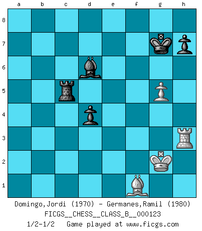 Last move : 1/2-1/2 2011 March 2 19:37:20 [Event "FICGS__CHESS__CLASS_B__000123"] [Site "FICGS"] [Date "2010.09.08"] [Round "1"] [White "Domingo,Jordi"] [Black "Germanes,Ramil"] [Result "1/2-1/2"] [WhiteElo "1970"] [BlackElo "1980"] 1.e4 c5 2.Nf3 Nc6 3.d4 cxd4 4.Nxd4 Nf6 5.Nc3 e5 6.Ndb5 d6 7.Bg5 a6 8.Na3 b5 9.Nd5 Be7 10.Bxf6 Bxf6 11.c4 b4 12.Nc2 O-O 13.g3 Be6 14.Bg2 Rb8 15.b3 Bxd5 16.cxd5 Nd4 17.Ne3 Rc8 18.Nc4 Rc5 19.O-O Qc7 20.Qd3 a5 21.h4 g6 22.Rab1 Bg7 23.Kh2 a4 24.h5 gxh5 25.Qd2 axb3 26.axb3 Rb8 27.Qg5 Nxb3 28.Rxb3 Rxc4 29.Rfb1 Rc2 30.Rxb4 Rxb4 31.Rxb4 Rxf2 32.Qxh5 Qa7 33.Qd1 Rf6 34.Rb2 Rh6+ 35.Bh3 Qd7 36.Rb8+ Bf8 37.Qf1 Qg4 38.Rb7 f6 39.Qg2 f5 40.exf5 Qxf5 41.Rb8 e4 42.Re8 Kf7 43.Re6 Rh5 44.g4 Qf4+ 45.Qg3 Qxg3+ 46.Kxg3 Rxd5 47.Rxe4 Rd3+ 48.Kh2 d5 49.Rf4+ Kg7 50.Bf1 Rd2+ 51.Kh1 Bd6 52.Rf3 d4 53.g5 Rc2 54.Rh3 Rc1 55.Kg2 Rc5 1/2-1/2 Sicilian : Pelikan (Lasker/Sveshnikov) variation Kingside Castling by player Black (move 12) Kingside Castling by player White (move 19) 10 pieces endgame at move 46 : White KRBP , Black KRBPPP WHITE : King + 1 Rook 1 Bishop 1 Pawn BLACK : King + 1 Rook 1 Bishop 3 Pawns 9 pieces endgame at move 47 : White KRBP , Black KRBPP WHITE : King + 1 Rook 1 Bishop 1 Pawn BLACK : King + 1 Rook 1 Bishop 2 Pawns This chess game ended in a draw. Follow this game move after move (download)Whoever sees no other aim in the game than that of giving checkmate to one's opponent will never become a good Chess player. (Euwe) Korrekt heißt in Deutschland die Haltung eines Mannes, dessen Benehmen nach dem Urteile seiner Nachbarn seiner Stellung angemessen ist. Um korrekt zu sein, muß man sich der Meinung der anderen anpassen... (Emanuel Lasker) Con o sin el título, Bobby Fischer fue sin lugar a dudas el mas grande jugador de su época. (Burt Hochberg) La solitude du joueur d'Echecs à l'approche du mat est semblable à celle du condamné. (Francis Szpiner) A mistake is only a mistake if you let it happen twice. Otherwise it is a learning experience. (Daniel Parmet)