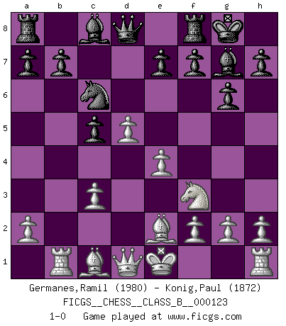 Last move : 1-0 2010 September 11 10:11:57 [Event "FICGS__CHESS__CLASS_B__000123"] [Site "FICGS"] [Date "2010.09.08"] [Round "1"] [White "Germanes,Ramil"] [Black "Konig,Paul"] [Result "1-0"] [WhiteElo "1980"] [BlackElo "1872"] 1.d4 Nf6 2.c4 g6 3.Nc3 d5 4.cxd5 Nxd5 5.e4 Nxc3 6.bxc3 Bg7 7.Nf3 O-O 8.Be2 c5 9.Rb1 Nc6 10.d5 1-0 King's Indian defense, 3.Nc3 Kingside Castling by player Black (move 7) Player White won this chess game. Follow this game move after move (download)Chess is a terrible game. If you have no center, your opponent has a freer position. If you do have a center, then you really have something to worry about ! (Siegbert Tarrasch) Wie ich sie so einen nach dem anderen nieder mähte wurde meine Überlegenheit offensichtlich. (José Raúl Capablanca) Vive, pierde y aprende al observar a tu oponente como ganar. (Amber Steenbock) D'abord les bases : Jouez et étudiez, puis étudiez et jouez, ensuite jouez et étudiez, puis étudiez et jouez. Deuxièmement : Donnez toujours le meilleur de vous-même ! (Ken Smith) To err is human, to shift the blame on someone else is tactical. (Mladen Jankovic)
