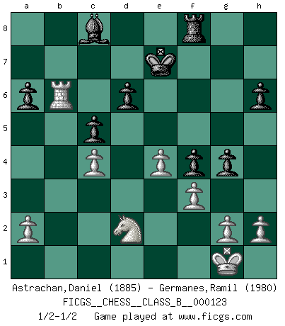 Last move : 1/2-1/2 2010 November 2 8:57:44 [Event "FICGS__CHESS__CLASS_B__000123"] [Site "FICGS"] [Date "2010.09.08"] [Round "1"] [White "Astrachan,Daniel"] [Black "Germanes,Ramil"] [Result "1/2-1/2"] [WhiteElo "1885"] [BlackElo "1980"] 1.e4 c5 2.Nf3 Nc6 3.Bb5 g6 4.O-O Bg7 5.d3 Nf6 6.Bxc6 bxc6 7.e5 Nd5 8.Nbd2 O-O 9.Ne4 d6 10.c4 Nc7 11.Re1 Ne6 12.Be3 h6 13.Qa4 Qc7 14.Rab1 Rb8 15.Qa3 f5 16.exf6 exf6 17.Bd2 f5 18.Ng3 Qf7 19.Bc3 g5 20.Bxg7 Qxg7 21.b4 a6 22.bxc5 Rxb1 23.Rxb1 g4 24.Nd2 Nxc5 25.Nb3 f4 26.Ne4 Nxe4 27.dxe4 c5 28.Nd2 Qd4 29.Qb2 Qxb2 30.Rxb2 Kf7 31.Rb6 Ke7 32.f3 1/2-1/2 Sicilian : Nimzovich-Rossolimo attack (with ...g6, without ...d6) Kingside Castling by player White (move 4) Kingside Castling by player Black (move 8) This chess game ended in a draw. Follow this game move after move (download)Fischer is an American Chess tragedy on par with Morphy and Pillsbury. (Mig Greengard) Was ist der Unterschied zwischen einem Strassenarbeiter und einem Schachspieler? --Der Schachspieler bewegt sich ab und zu. (Anonymous) Dios mío, Bobby Fischer juega tan simple. (Alexei Suetin) Un journaliste : 'Vous préférez avoir une dame de plus sur l'échiquier ou au lit ?' Boris Spassky : 'Ca dépend de la position.' The production of too many useful things results in too many useless people. (Karl Marx)