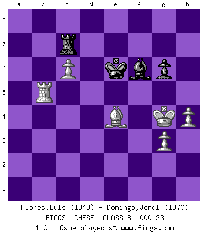 Last move : 1-0 2011 June 23 19:1:1 [Event "FICGS__CHESS__CLASS_B__000123"] [Site "FICGS"] [Date "2010.09.08"] [Round "1"] [White "Flores,Luis"] [Black "Domingo,Jordi"] [Result "1-0"] [WhiteElo "1848"] [BlackElo "1970"] 1.e4 c5 2.Nf3 h6 3.Nc3 d6 4.d4 cxd4 5.Nxd4 Nf6 6.Bc4 e5 7.Nf5 Nc6 8.O-O Bxf5 9.exf5 Qd7 10.Nd5 Be7 11.c3 O-O 12.Qf3 Rac8 13.Rd1 Rfe8 14.Bb3 Na5 15.Nxf6+ Bxf6 16.Bd5 Rc7 17.Be4 b5 18.b3 Rb8 19.Ba3 Rb6 20.h3 Ra6 21.Bb2 Nc6 22.Qd3 Ne7 23.a4 Rb6 24.a5 Ra6 25.Ba3 Rxa5 26.Qxd6 Qxd6 27.Bxd6 Rxa1 28.Rxa1 Rxc3 29.Rxa7 Nc6 30.Ra8+ Kh7 31.Rf8 Rc1+ 32.Kh2 Rd1 33.Bc5 Nd8 34.Kg3 h5 35.Kf3 h4 36.b4 Rd7 37.Re8 g6 38.g3 Nb7 39.Rb8 Nxc5 40.bxc5 hxg3 41.fxg3 Kg7 42.c6 Rc7 43.fxg6 fxg6 44.Rxb5 Be7 45.Rxe5 Kf6 46.Rb5 Ke6 47.Kg4 Bf6 48.h4 1-0 Sicilian defense Kingside Castling by player White (move 8) Kingside Castling by player Black (move 11) 10 pieces endgame at move 45 : White KRBPPP , Black KRBP WHITE : King + 1 Rook 1 Bishop 3 Pawns BLACK : King + 1 Rook 1 Bishop 1 Pawn Player White won this chess game. Follow this game move after move (download)After a bad opening, there is hope for the middle game. After a bad middle game, there is hope for the endgame. But once you are in the endgame, the moment of truth has arrived. (Edmar Mednis) Schach sollte überall auf der Welt Schulfach werden. Es fördert die geistige Auseinandersetzung. Es lehrt die Demut in der Niederlage. (Garry Kasparov) Cuando estes solo, cuando te sientas un extraño en el mundo, juega al Ajedrez. Esto levantará tu espiritu y será tu consejero de guerra. (Aristóteles) Plusieurs personnes se sont demandées comment Tal faisait pour gagner... En fait, c'est très simple ! Il met ses pièces au centre de l'échiquier et les sacrifie quelque part ! (David Bronstein) The leaves of memory seemed to make a mournful rustling in the dark. (Henry Wadsworth Longfellow)
