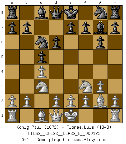 Last move : 0-1 2010 September 11 5:48:36 [Event "FICGS__CHESS__CLASS_B__000123"] [Site "FICGS"] [Date "2010.09.08"] [Round "1"] [White "Konig,Paul"] [Black "Flores,Luis"] [Result "0-1"] [WhiteElo "1872"] [BlackElo "1848"] 1.c4 c5 2.Nf3 Nc6 3.g3 g6 4.Bg2 Bg7 5.Nc3 d6 0-1 English : Symmetrical variation Player Black won this chess game. Follow this game move after move (download)The hardest game to win is a won game. (Emanuel Lasker) Mein Gehirn das ist mein zweitwichtigstes Organ [Aus dem Film: Der Schläfer]. (Woody Allen) Una victoria por una combinación errónea, aunque sea espectacular, me llena de horror artístico. (Wilhelm Steinitz) Même si vous avez un bon coup à faire, regardez toujours s'il n'y en a pas un qui lui soit préférable. (Pedro Damiano) Warrior pose battles inner weakness and wins focus. You see that there is no war within you. You're on your own side, and you are your own strength. (Terri Guillemets)