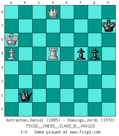 Last move : 1-0 2011 November 18 15:8:58 [Event "FICGS__CHESS__CLASS_B__000123"] [Site "FICGS"] [Date "2010.09.08"] [Round "1"] [White "Astrachan,Daniel"] [Black "Domingo,Jordi"] [Result "1-0"] [WhiteElo "1885"] [BlackElo "1970"] 1.d4 Nf6 2.c4 c5 3.d5 e6 4.Nc3 exd5 5.cxd5 d6 6.e4 g6 7.Nf3 a6 8.a4 Bg4 9.a5 Nbd7 10.Be2 Bxf3 11.Bxf3 Bg7 12.O-O O-O 13.Bf4 Qc7 14.Qc2 Rfe8 15.Ra4 h6 16.h3 Re7 17.Be3 Rae8 18.g3 Ne5 19.Bg2 Kh7 20.f4 Ned7 21.Rd1 Qc8 22.g4 Kg8 23.Ra3 Qb8 24.Rb3 Nf8 25.Bf2 Rd7 26.Na4 R7d8 27.e5 dxe5 28.Nxc5 exf4 29.Rxb7 Qe5 30.Qb3 N8d7 31.d6 Qg5 32.Nxd7 Rxd7 33.Rxd7 Nxd7 34.Qb7 Rd8 35.Qxa6 h5 36.Rd5 f5 37.Qe2 hxg4 38.hxg4 Nf6 39.Qe7 Rd7 40.Qe6+ Kh7 41.Bd4 Rb7 42.Bxf6 Bxf6 43.d7 f3 44.Bxf3 Qf4 45.Qxf6 Qg3+ 46.Bg2 Qe3+ 47.Kf1 Qc1+ 48.Kf2 Rxb2+ 49.Qxb2 Qxb2+ 50.Kg3 Qb8+ 51.Kh3 g5 52.Be4 Qf4 53.d8Q Qxg4+ 54.Kh2 Qh4+ 55.Kg2 Qxe4+ 56.Kf2 Qh4+ 57.Ke2 Qe4+ 58.Kd2 Qb4+ 59.Kd3 Qe4+ 60.Kc3 Qe3+ 61.Kc4 Qc1+ 62.Kb5 Qb2+ 63.Ka6 1-0 Benoni : Classical with e4 and Nf3 Kingside Castling by player White (move 12) Kingside Castling by player Black (move 12) 10 pieces endgame at move 49 : White KRBPPP , Black KQPP WHITE : King + 1 Rook 1 Bishop 3 Pawns BLACK : King + 1 Queen 2 Pawns Promotion Queen by player White (move 53) 9 pieces endgame at move 53 : White KQRBP , Black KQPP WHITE : King + 1 Queen 1 Rook 1 Bishop 1 Pawn BLACK : King + 1 Queen 2 Pawns 8 pieces endgame at move 55 : White KQRP , Black KQPP WHITE : King + 1 Queen 1 Rook 1 Pawn BLACK : King + 1 Queen 2 Pawns Player White won this chess game. Follow this game move after move (download)Fischer Chess play was always razor-sharp, rational and brilliant. One of the best ever. (Dave Regis) Mit Schach schule ich mein Gefühl für Geometrie, was für Tennis und Schach gleichermaßen wichtig ist. (Boris Becker) Un mal plan es mejor que no tener ningún plan. (Frank Marshall) L'attaque fait le spectacle, la défense gagne les matchs. (Dicton footballistique) Nobody is always a winner, and anybody who says he is, is either a liar or doesn't play poker. (Amarillo Slim)