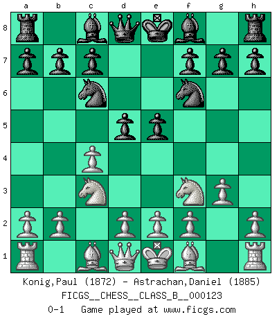Last move : 0-1 2010 September 13 0:52:41 [Event "FICGS__CHESS__CLASS_B__000123"] [Site "FICGS"] [Date "2010.09.08"] [Round "1"] [White "Konig,Paul"] [Black "Astrachan,Daniel"] [Result "0-1"] [WhiteElo "1872"] [BlackElo "1885"] 1.c4 e5 2.Nc3 Nf6 3.Nf3 Nc6 4.g3 d5 0-1 English Opening Player Black won this chess game. Follow this game move after move (download)Good offense and good defense both begin with good development. (Bruce A. Moon) Schach ist ein Kampf gegen den Fehler. (Johannes Herrman Zukertort) La partida mas dura de ganar es una partida ganada. (Emanuel Lasker) Les réformistes prétendent que les progrès de la théorie conduiront à la disparition des échecs, et qu'il faut, pour leur rendre vie, en remanier les règles. En réalité, qu'exprime cette affirmation? Le mépris de l'intuition, de l'imagination et de tous les autres éléments qui font des échecs un art. (Alexander Alekhine) The only thing that overcomes hard luck is hard work. (Harry Golden)