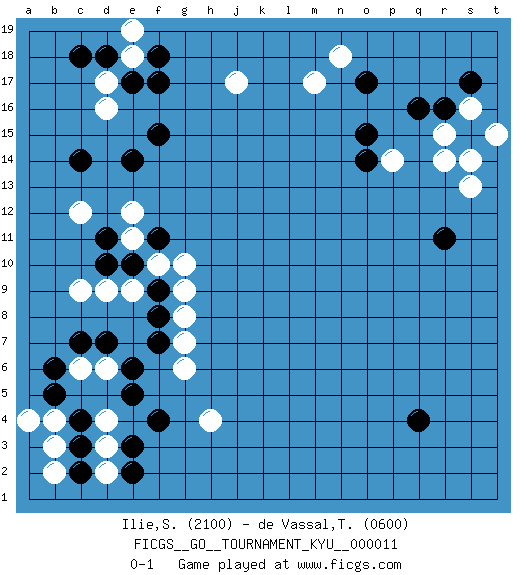 Last move : 0-1 2007 March 26 2:49:47 [Event "FICGS__GO__TOURNAMENT_KYU__000011"] [Site "FICGS"] [Date "2006.11.22"] [Round "1"] [Black "Ilie,Sebastian"] [White "de Vassal,Thibault"] [Result "0-1"] [Rating 1 "2100"] [Rating 2 "0600"] 1.q16 r14 2.r11 d4 3.q4 d16 4.f17 j17 5.c14 e18 6.e17 d17 7.f18 e19 8.f15 m17 9.o17 c12 10.e14 n18 11.c18 p14 12.o15 s16 13.o14 s13 14.s15 r15 15.s17 s14 16.r16 t15 17.d7 c6 18.c7 c9 19.b6 b4 20.d18 e9 21.f7 g9 22.f4 d6 23.e6 g6 24.e5 h4 25.e3 d3 26.e2 d2 27.b5 b2 28.c4 a4 29.c3 b3 30.c2 g7 31.f8 g8 32.f9 f10 33.e10 e11 34.d10 d9 35.f11 g10 36.d11 e12 0-1 This go game has been lost on time (started : 2006.11.22 5:57:0) Comment by player 2 : Thibault de Vassal : Hello Sebastian. Very sorry to win this lost game on time... I suppose you had connection problems :/ Greetings and have good Go. Here are the names of the openings (joseki) played in the four corners : Corner q16 : q16 r14 Hoshi (Hwajeom, Seongjeom, Xingwei`) 4-4 Point. The star or hoshi (4-4) point, emphasizing influence at the potential expense of territory. Ikken Kakari (Hankan Keolch'im, Yi Gua`jiao~, 1-Space Low Approach). White 2 is the standard approach move to the 4-4. Corner d16 : d16 f17 Hoshi (Hwajeom, Seongjeom, Xingwei`) 4-4 Point. The star or hoshi (4-4) point, emphasizing influence at the potential expense of territory. Ikken Kakari (Hankan Keolch'im, Yi Gua`jiao~, 1-Space Low Approach). Black 2 is the standard approach move to the 4-4. Corner d4 : d4 d7 Hoshi (Hwajeom, Seongjeom, Xingwei`) 4-4 Point. The star or hoshi (4-4) point, emphasizing influence at the potential expense of territory. Nikken Takagakari (Dukan Nop'dakeolch'im, E`r Gaojia, 2-Space High Approach). Black 2 is a light approach move. Rarely played in even games, Black 2 is typically employed in handicap games. White continues with 6-4 or 3-10. In Korean Sunjang Baduk White has a stone on 8-4. Player White won this Go (weiqi, baduk) game. Follow this game move after move (download)Win the early ko to win the game. (Anonymous) Yoga is 99% practice and 1% knowledge. (Sri Krishna Pattabhi Jois)