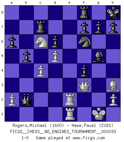 Last move : 1-0 2010 September 18 0:11:35 [Event "FICGS__CHESS__NO_ENGINES_TOURNAMENT__000033"] [Site "FICGS"] [Date "2010.09.09"] [Round "1"] [White "Rogers,Michael"] [Black "Hase,Pavel"] [Result "1-0"] [WhiteElo "1600"] [BlackElo "2181"] 1.e4 c5 2.Nf3 d6 3.d4 cxd4 4.Nxd4 Nf6 5.Nc3 a6 6.Bg5 e6 7.f4 b5 8.Bxf6 Qxf6 9.g3 Be7 10.Bg2 Ra7 11.O-O O-O 12.Qd2 Rd7 13.Qe3 Qh6 14.Rad1 Bd8 15.g4 e5 16.Nf5 Qe6 17.Nd5 Kh8 18.g5 Bb7 19.Bh3 exf4 20.Qc3 Qe5 21.Nd4 Bxd5 22.exd5 Rc7 23.Qf3 Bxg5 24.Rfe1 Qf6 25.Rd2 Nd7 26.Nc6 Qxb2 27.Rde2 Nf6 28.c4 1-0 Sicilian : Najdorf, Polugayevsky variation Kingside Castling by player White (move 11) Kingside Castling by player Black (move 11) Player White won this chess game. Follow this game move after move (download)Pawns: they are the soul of this game, they alone form the attack and defense. (Philidor) Über die Verhaftung Bobby Fischers: Warum es die Bush-Administration für nötig befindet einen 61 Jahre alten Mann zu hetzten, der für niemanden ausser sich selbste eine Gefahr darstellt ist ein Rätsel. (Nigel Short) El Ajedrez es un invernadero donde los frutos del carácter pueden madurar mas completamente que en la vida. (Edward Morgan Foster) Dieu déplace le joueur, et celui-ci la pièce. Quel Dieu derrière Dieu commence donc la trame ? Arturo Perez-Reverte (prix de littérature policière 1993). What doesn't kill us makes us stronger. (Friedrich Nietzsche)